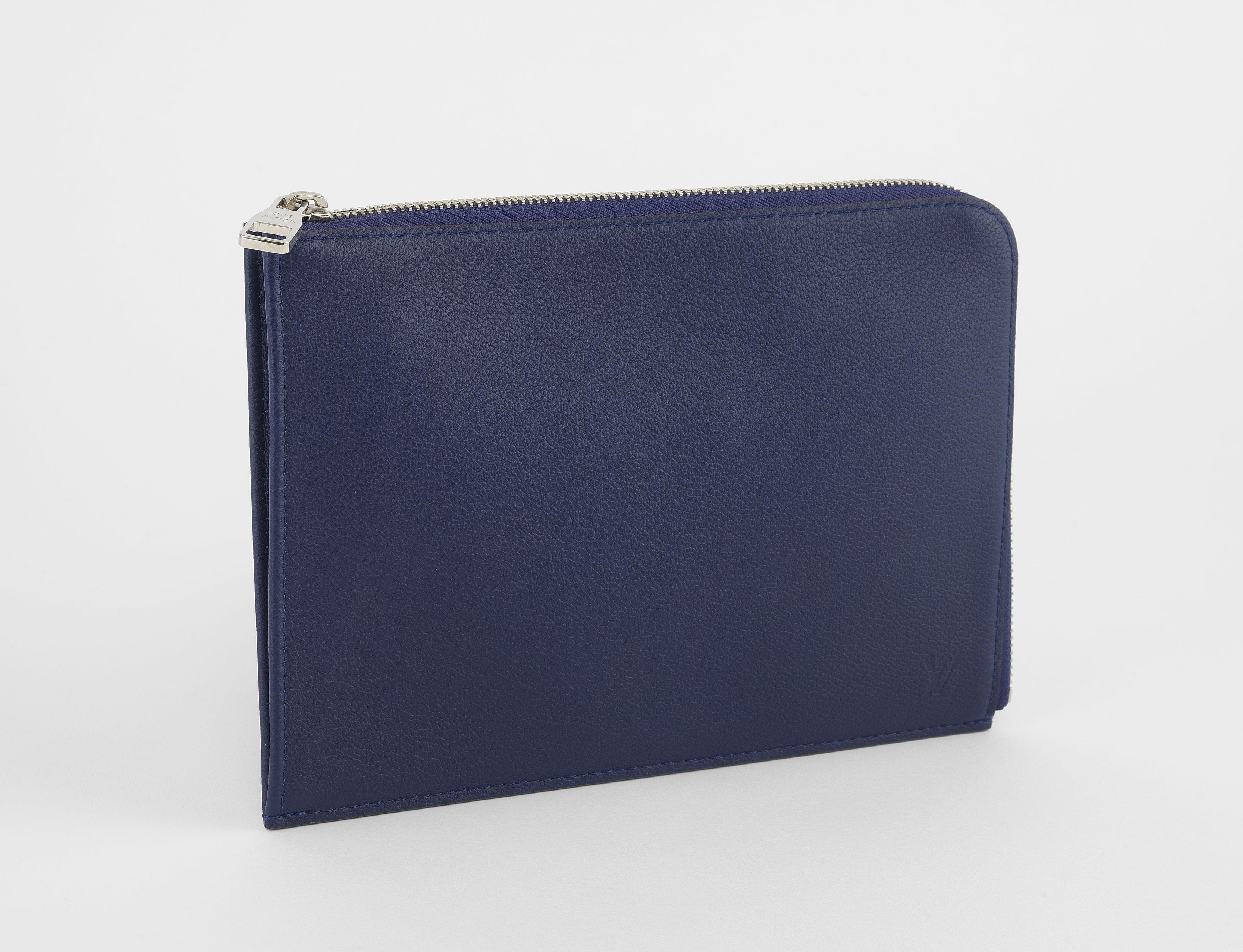 Cuir Taurillon bleu indigo, intérieur en microfibre bleu, fermeture zippée, 24x15 cm