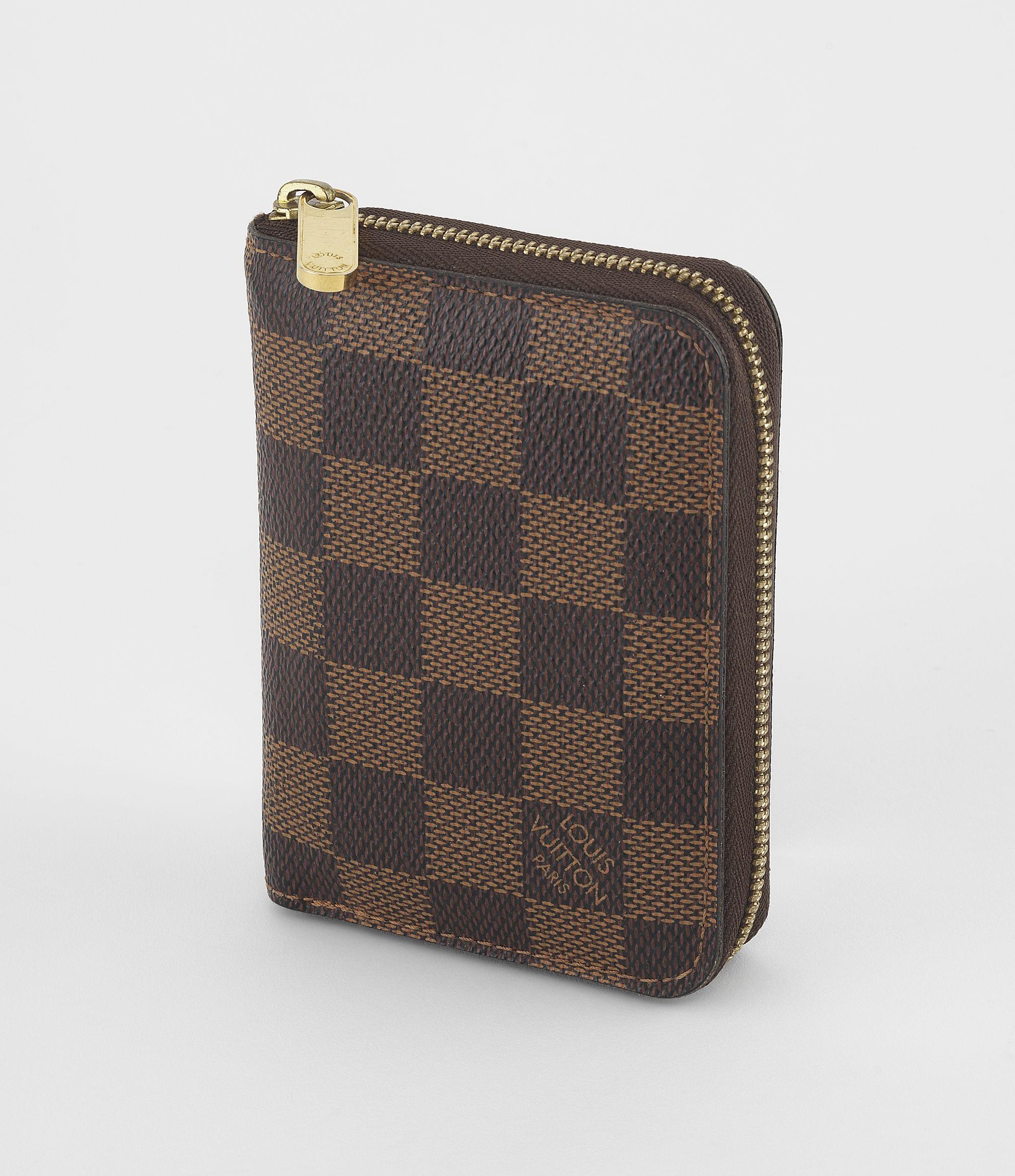 Toile damier ébène, intérieur avec deux soufflets pour quatre cartes, billets et monnaie, fermeture zippée dorée, 12x8 cm