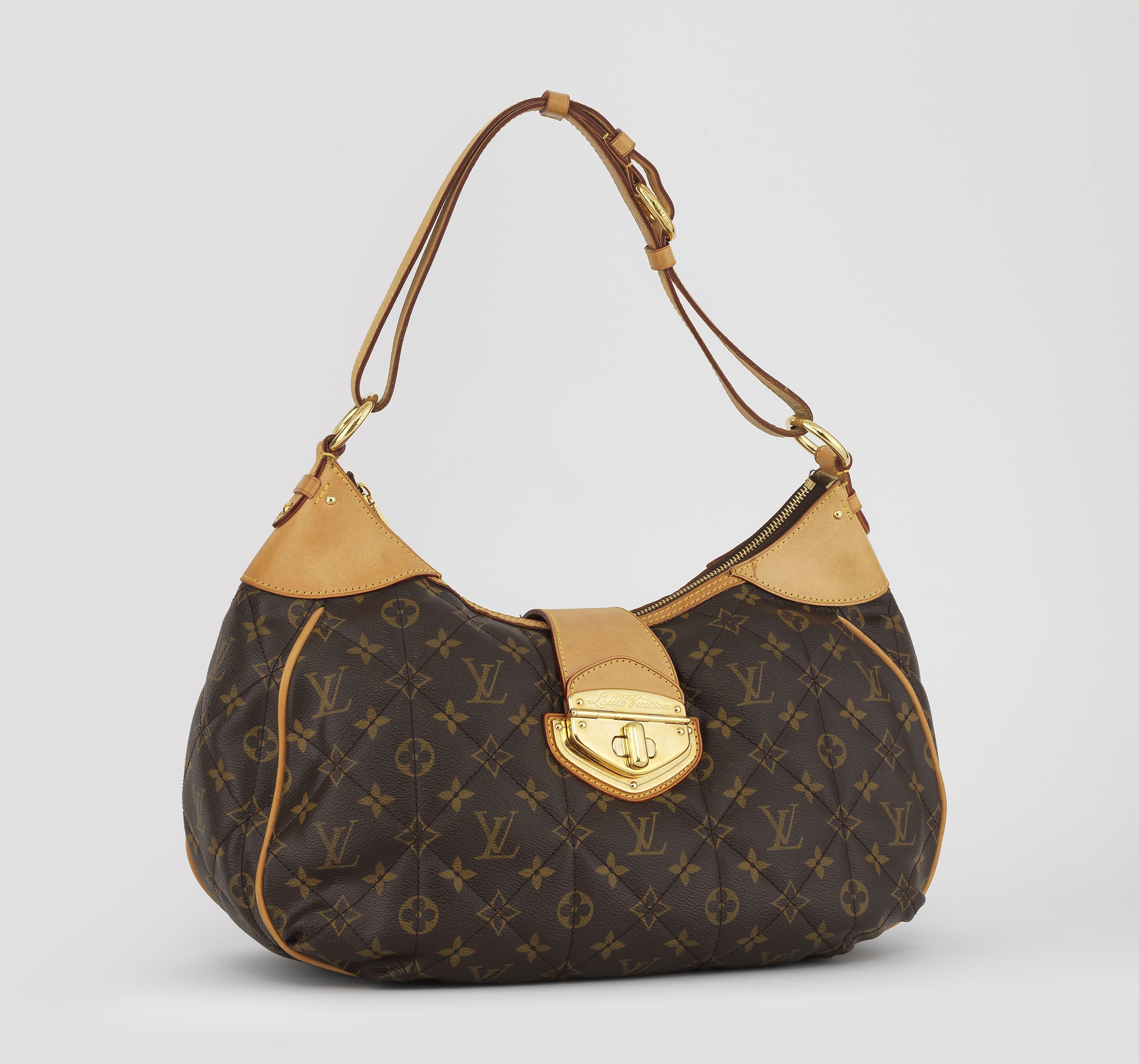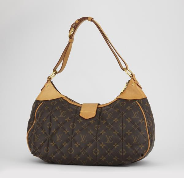 Toile Monogram et cuir naturel, intérieur en microfibre beige avec poches latérales, fermeture zippée et fermoir logoté, garniture en métal doré, env. 29x40x18 cm