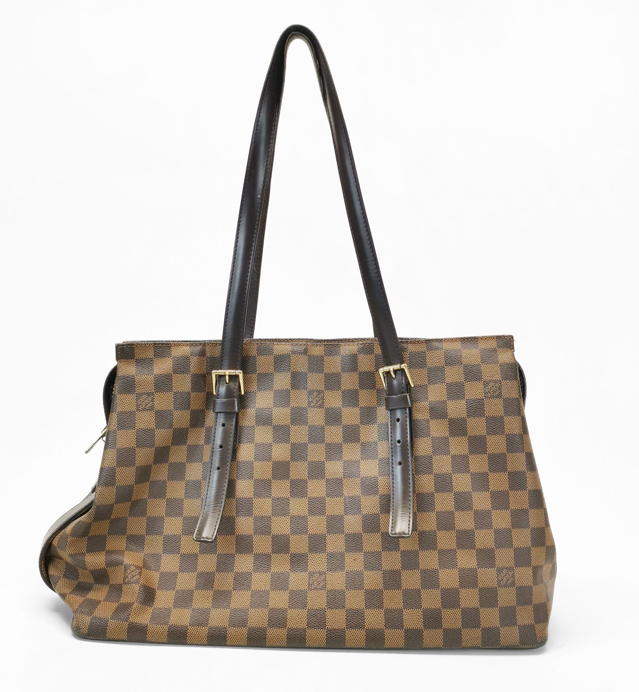 Toile enduite damier, cuir chocolat, fermeture zippée, intérieur en soie orange avec une poche latérale zippée, anses réglables, 41x23x14 cm