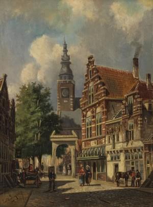 Ville flamande animée, huile sur panneau, signée, 63,5x25 cm