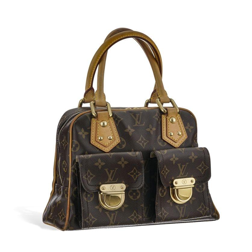 Cuir monogrammé, deux poches extérieures, deux anses, 20x29 cm
