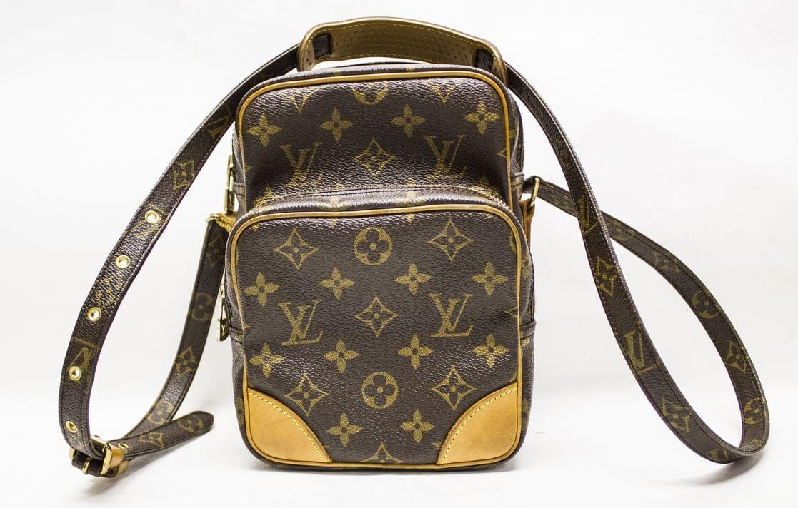 Toile monogram et cuir naturel, bandoulière réglable, deux compartiments, fermeture Eclair, H 23 cm et L 17 cm