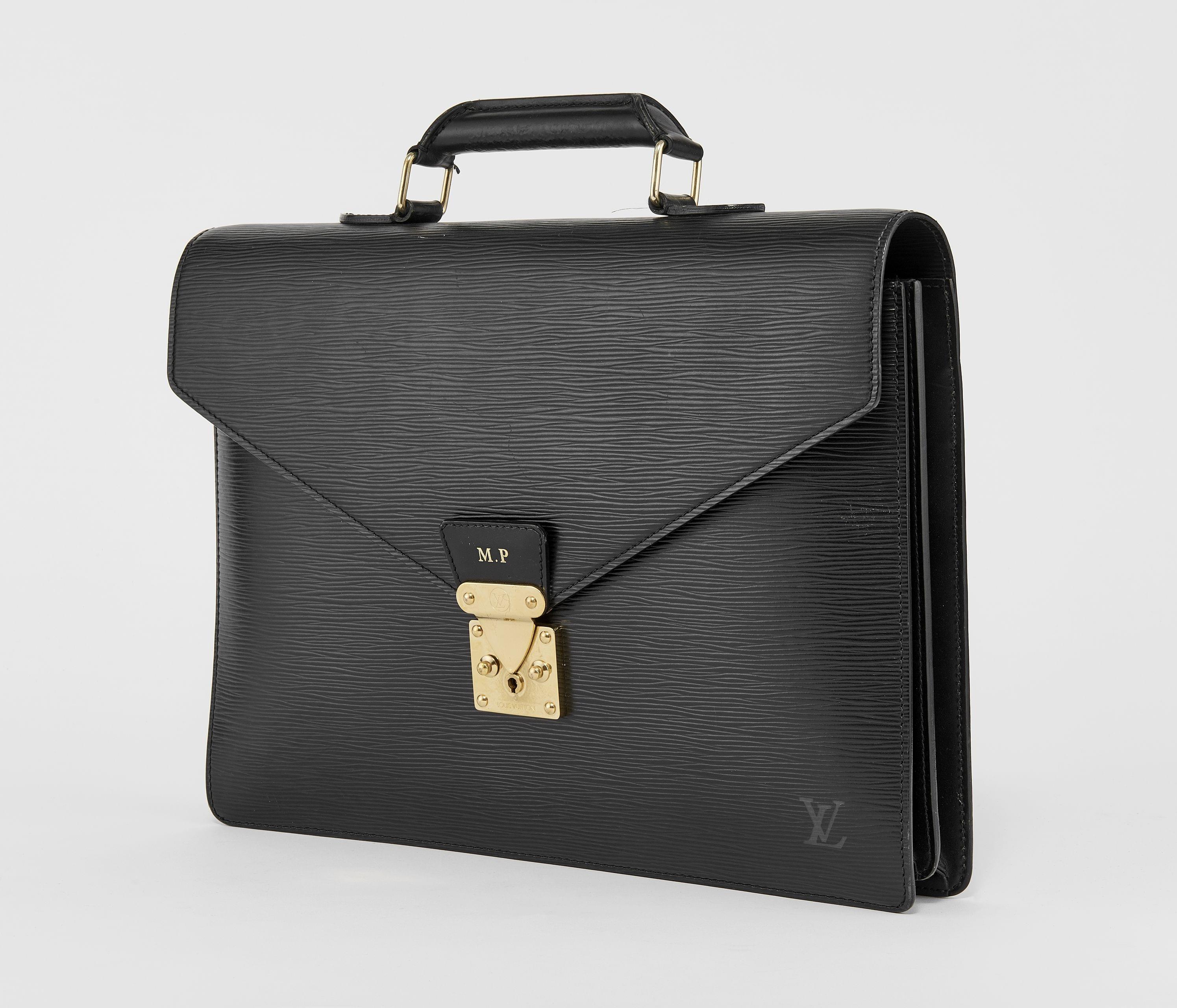 Cuir noir, surpiqûre blanche, intérieur toile, 26x34 cm. Provena...