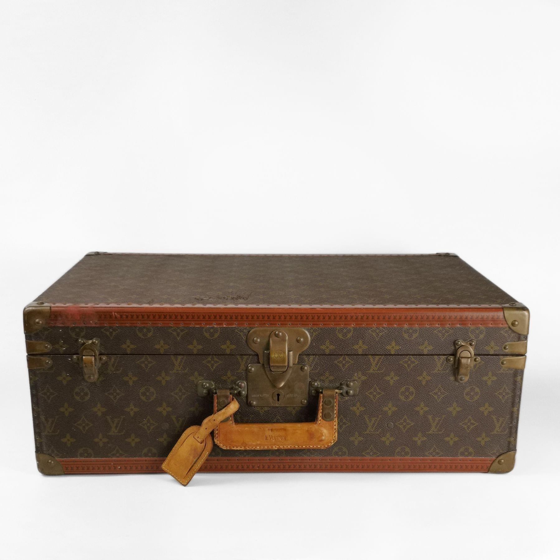 Toile enduite monogrammée, renforts en cuir brun et garniture en laiton, 41x60x21 cm
