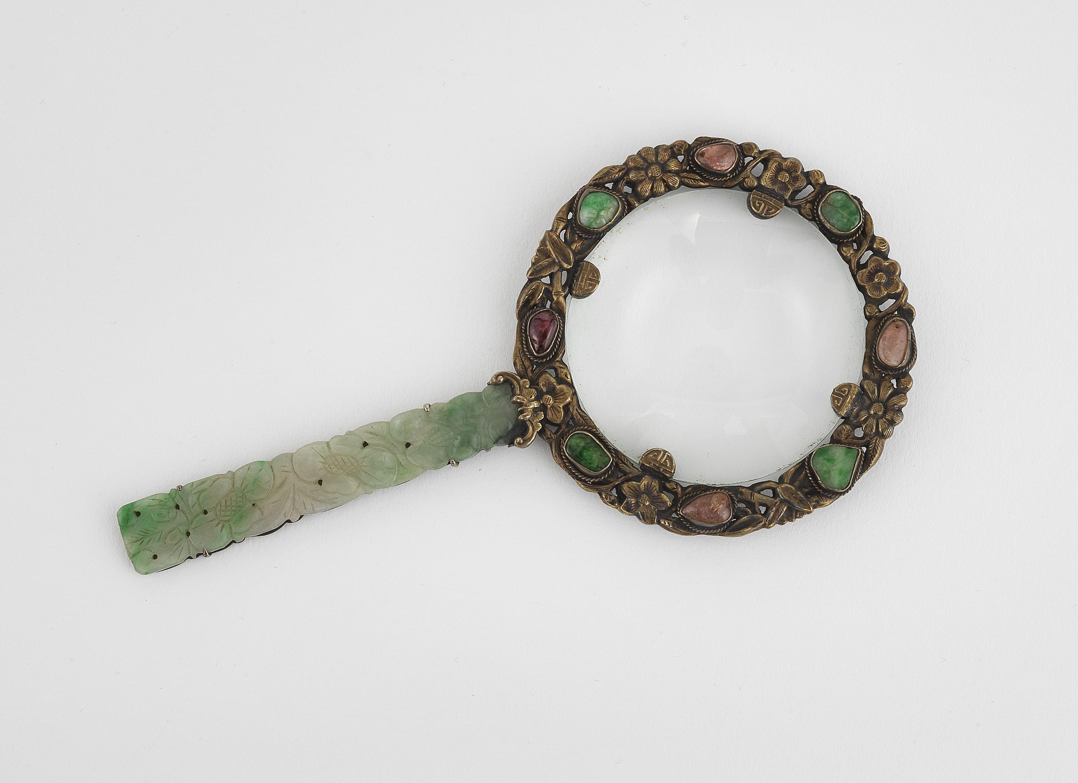 Monture en argent doré et cabochons de pierres, manche en jade sculpté, L 13,5 cm