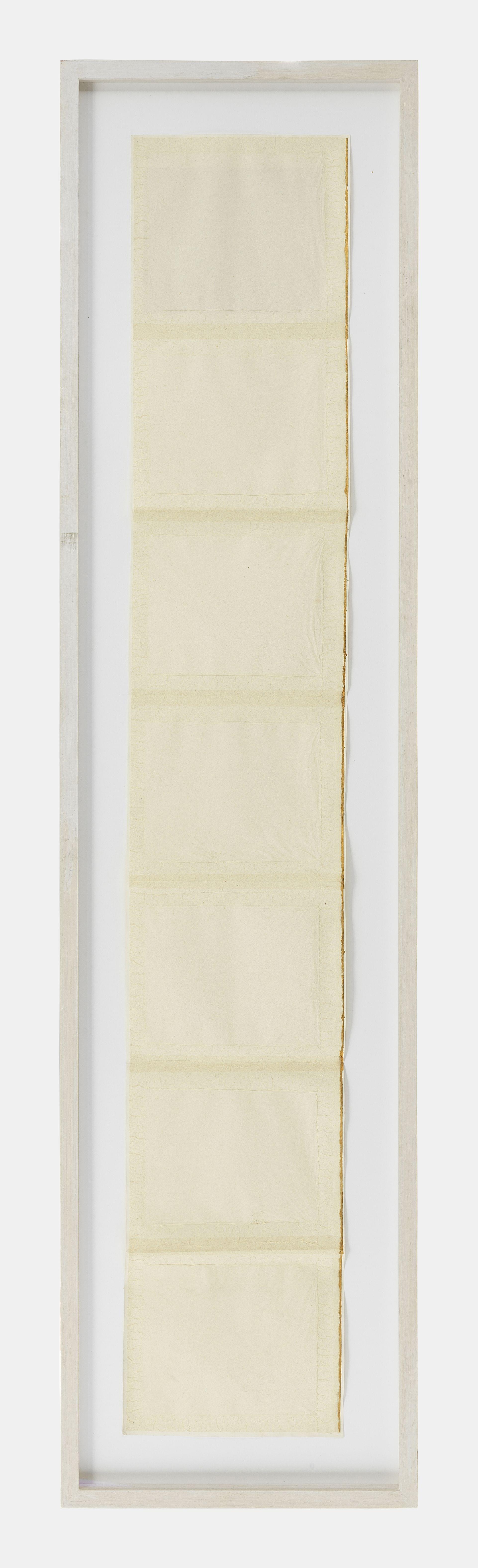 Kleenex, sept kleenex verticaux et peinture bronze, signé et daté 1977 et inscrit Kleenex verticali & pennellato dorato au dos, 140x23,5 cm Provenance: Studio d'Arte Contemporanea Dabbeni à Lugano. On y joint le certificat de la galerie; collection Marisa Perret-Rezzonico