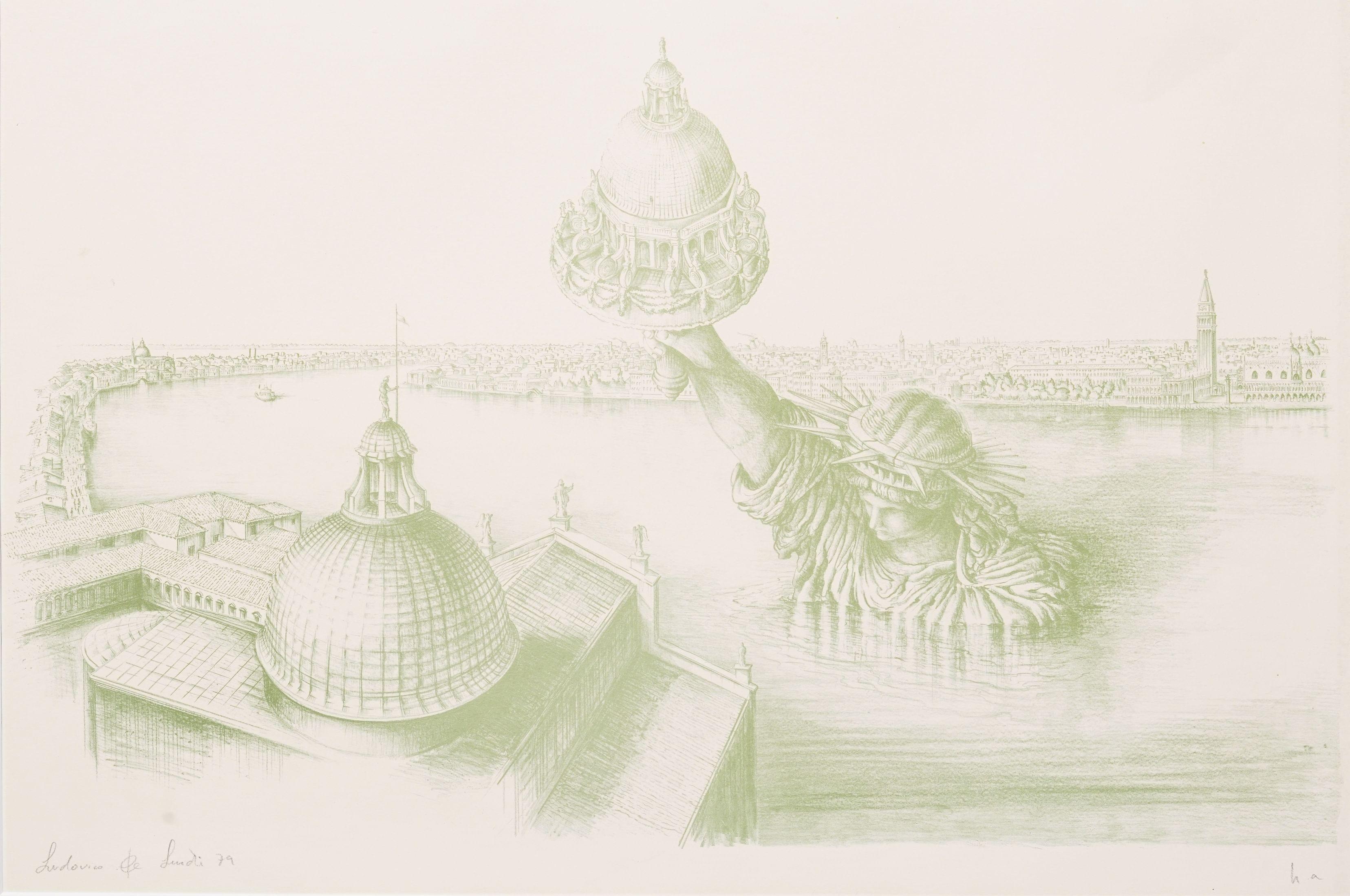 Venise - New York, 1979, lithographie en vert sur papier, signée, datée 79, h.a., 44 x 72 cm