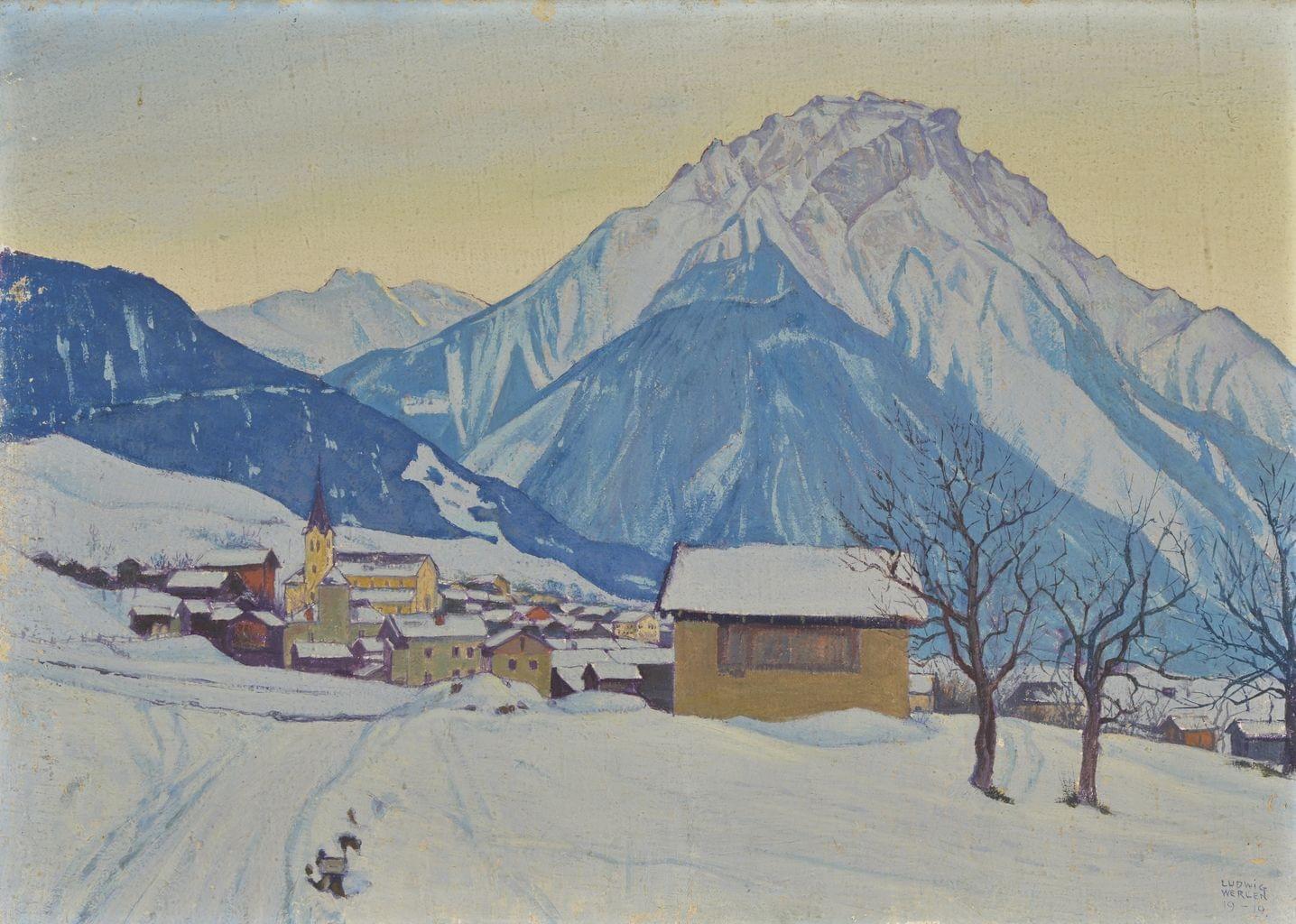 Village enneigé, huile sur toile, signée, datée 1919, 51x71 cm