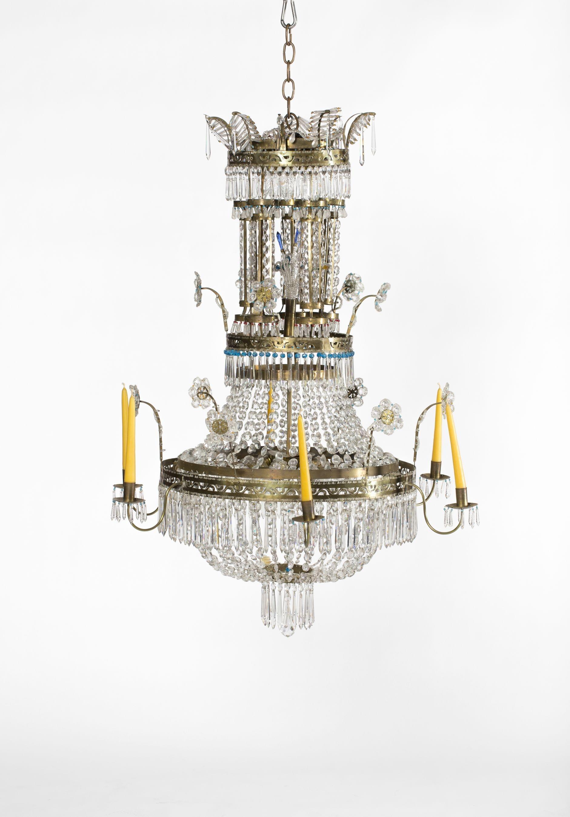 Bronze doré et pampilles de verre facetées, marbre blanc, H 53 c...