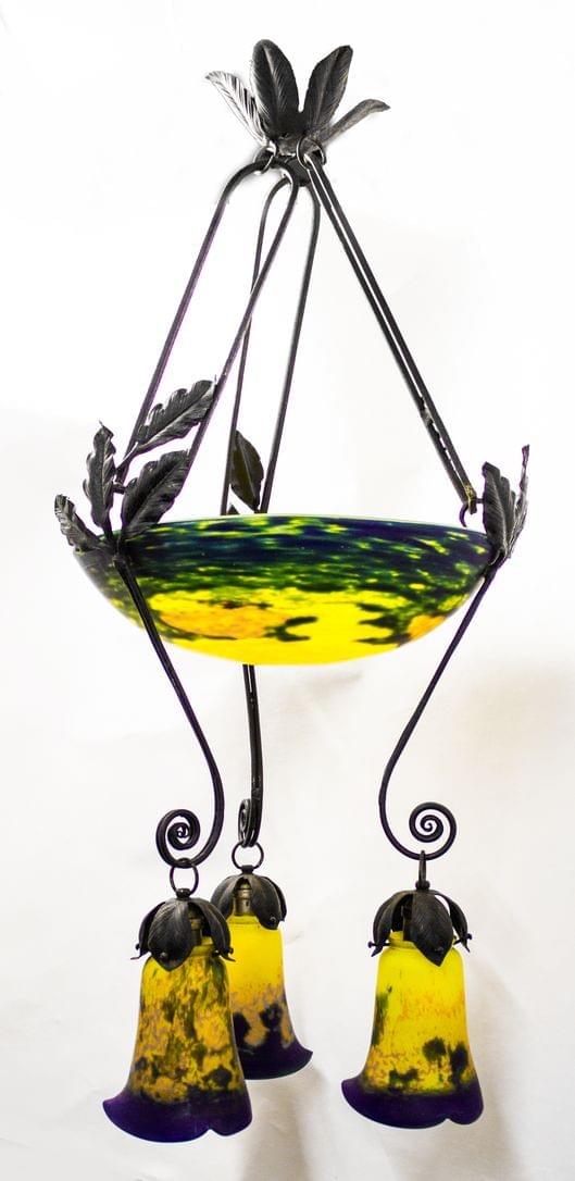 3 lumières, une vasque, verre marbré jaune orangé et bleu, fer forgé, H 70 cm env.