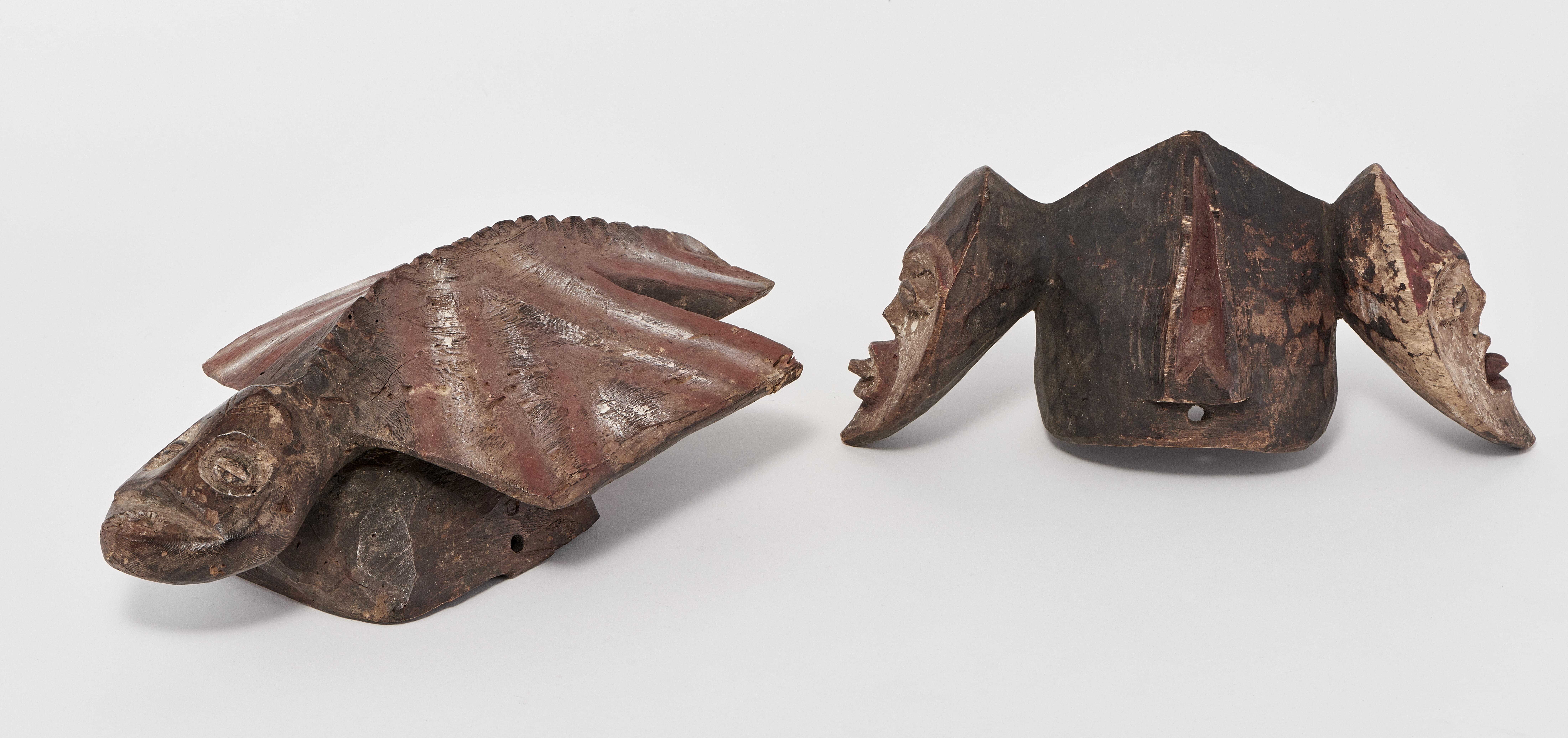 Bois à patine noire, rouge et blanche, l'un en forme d'oiseau, l'autre de deux visages, L 38 et 28 cm