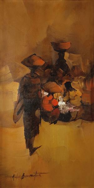 Personnages au marché, huile sur toile marouflée sur panneau, 59...