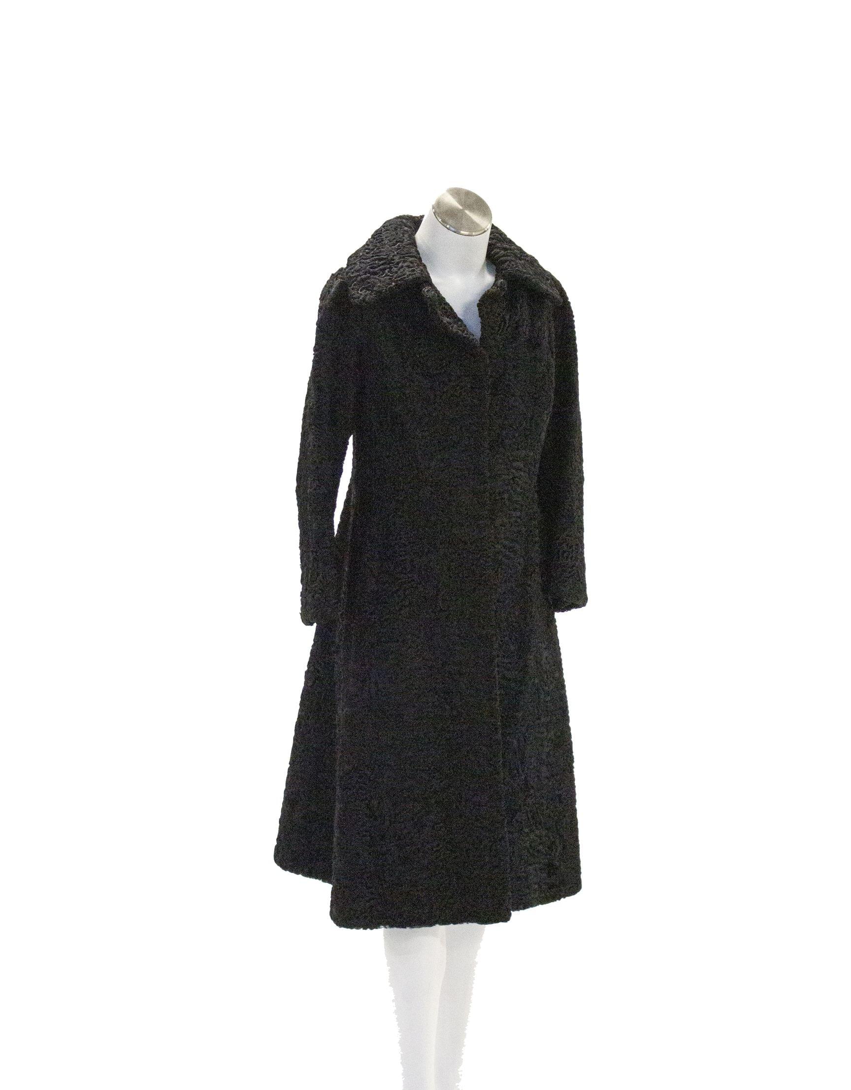 Fourrure d'astrakan noir, intérieur en tissu noir, fermeture à crochets, poches latérales