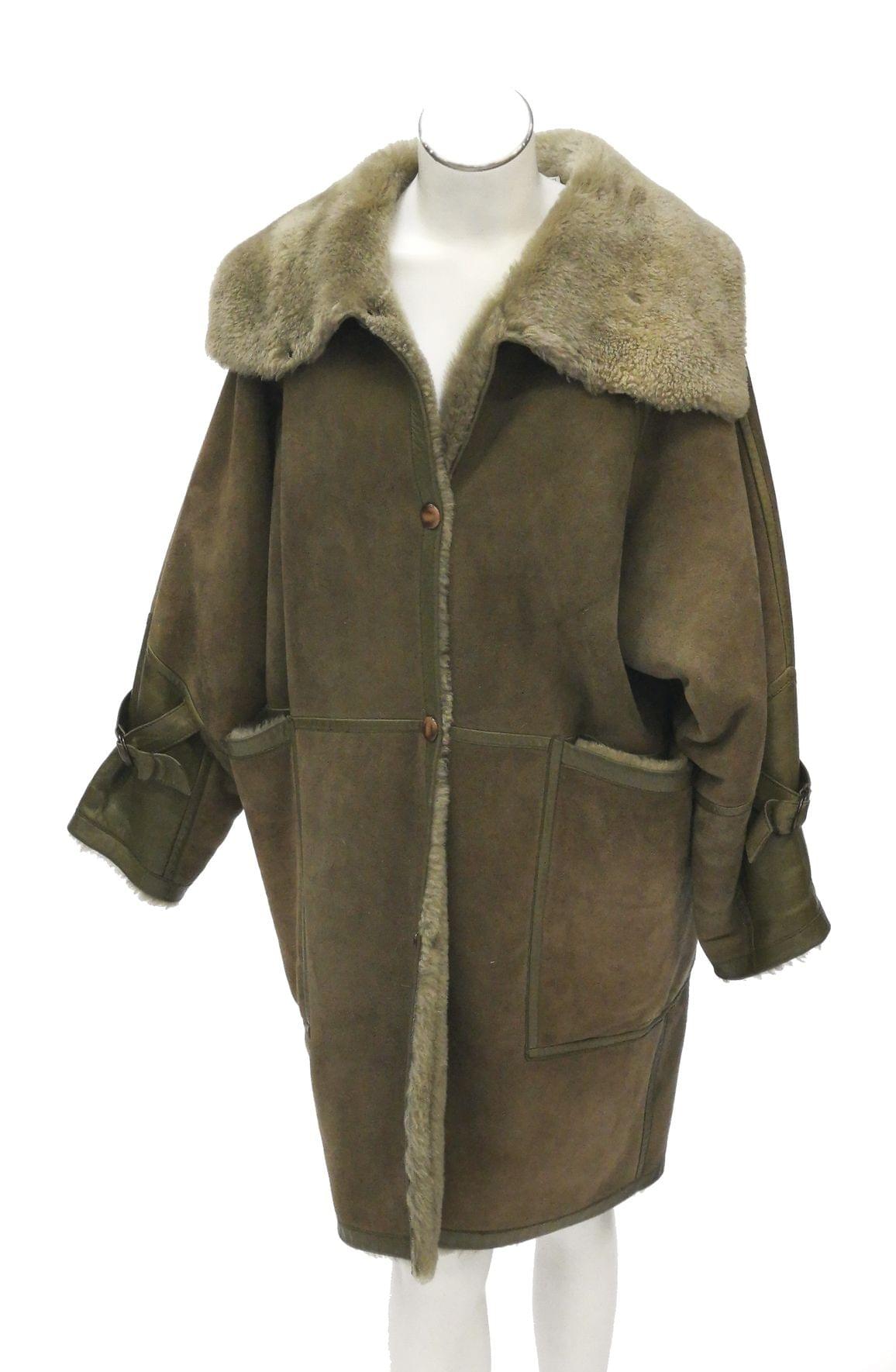 Mouton retourné et cuir gris-vert, poches latérales, boutons à pression