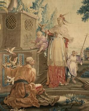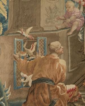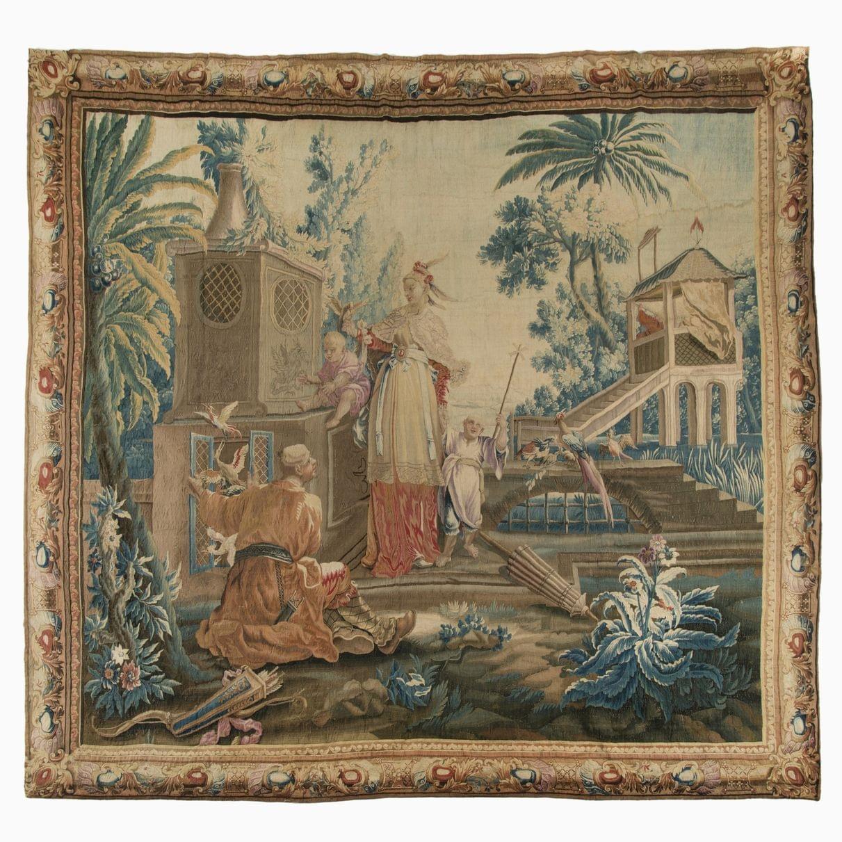 L'oiseleur chinois, atelier de Jean-François Picon, 280x308 cm. Sujet inspiré de la seconde tenture chinoise, éditée une première fois par la manufacture de Beauvais sur des cartons de Jean-Joseph Dumons (1687-1779) d'après les modelli de François Boucher (1742) et réédité par Beauvais une seconde fois et la Manufacture d'Aubusson sur les cartons de Dumons achetés par le marchand-fabricant aubussonnais, Jean-François Picon. Une tapisserie identique est conservée aux Musées Royaux d'Art et d'Histoire de Bruxelles (no d'inventaire 2918 - Cat.112)