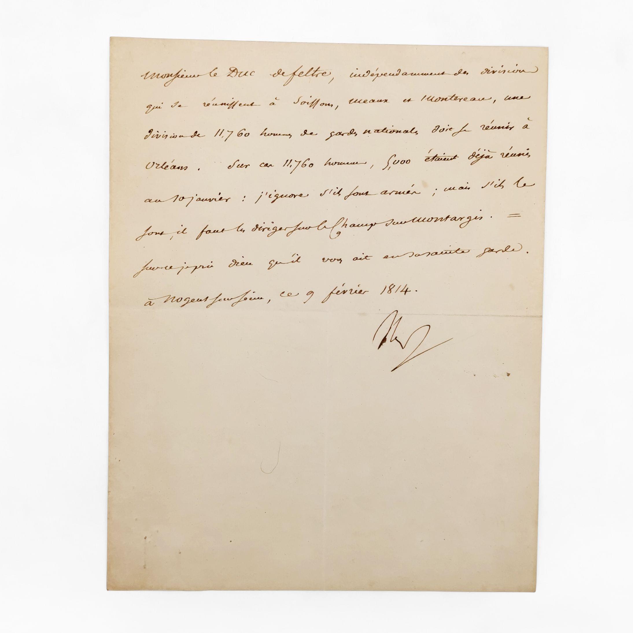 Portant la signature autographe de Napoléon I, adressée au maréchal Clarke, duc de Feltre, 1765-1818, datée du 9 février 1814, dans laquelle il lui donne l’ordre de déplacer des troupes. En effet, au cours de la Campagne de France, de la fin de 1813 jusqu’à l’abdication de Napoléon le 6 avril 1814, les combats eurent lieu dans l’est de la France, de plus en plus près de Paris. Le 5 février, le Congrès de Chatillon en Champagne réunit les quatre puissances coalisées, Autriche, Russie, Prusse et Angleterre, contre une France isolée. Le 8 février, Napoléon refuse les conditions des Coalisés ; la guerre va reprendre. C’est donc dans ce climat que l’empereur enjoint à Clarke, qui lui est resté fidèle, de déplacer des troupes, pour éviter l’encerclement de Paris.
