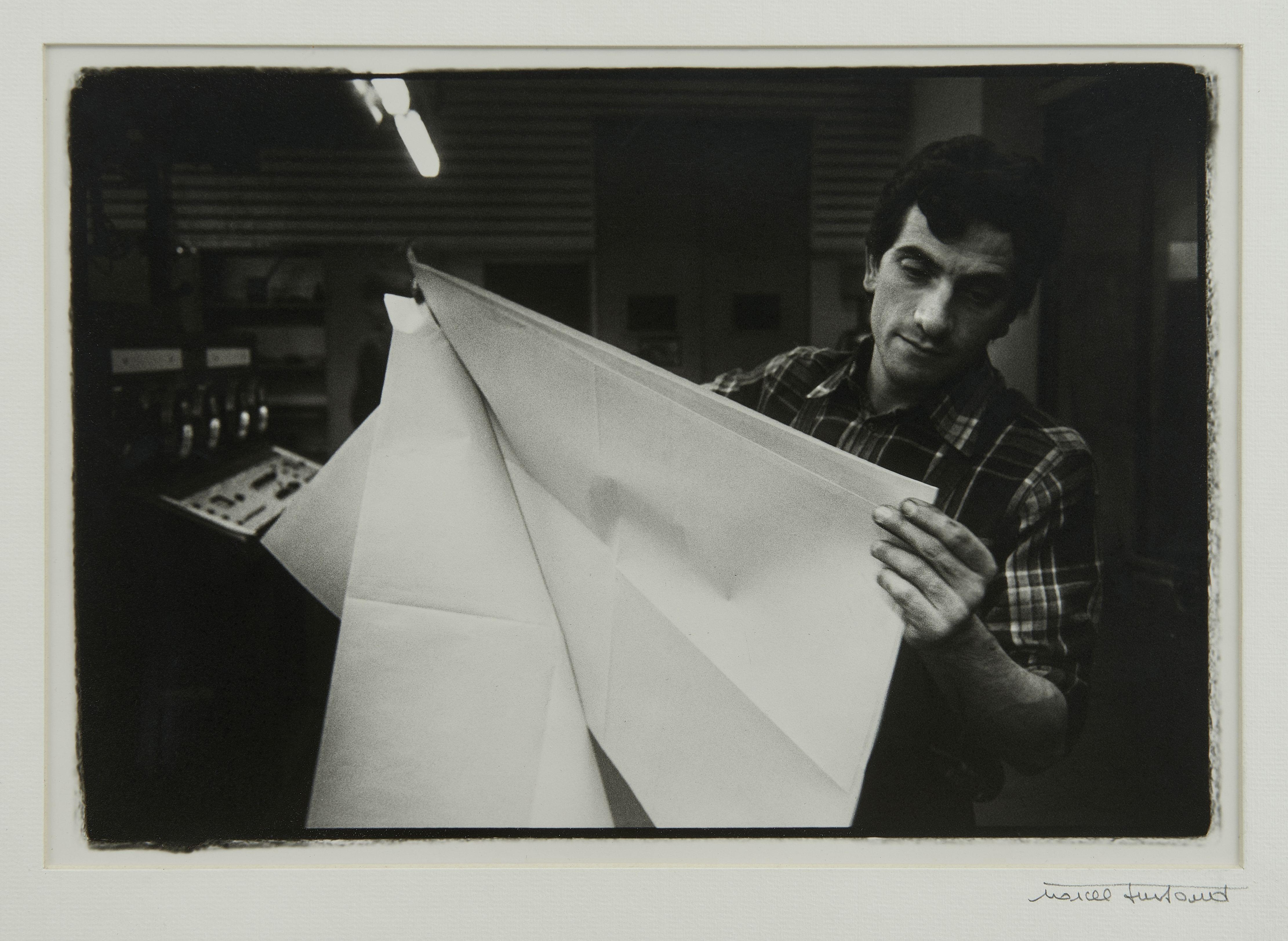 "11h Milan, imprimerie de "La Notte", contrôle du format du papier avant l'impression", de la série "Quotidiens au quotidien", circa 1990, tirage argentique, 20x30 cm