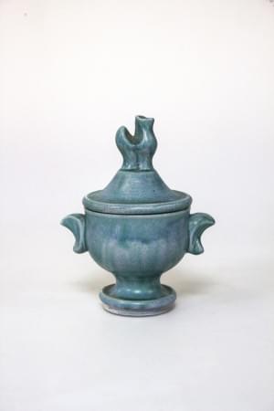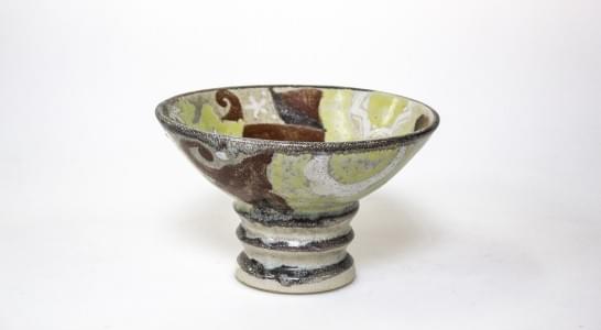 Coupe sur pied à décor de fleurs, céramique émaillée noire, roug...