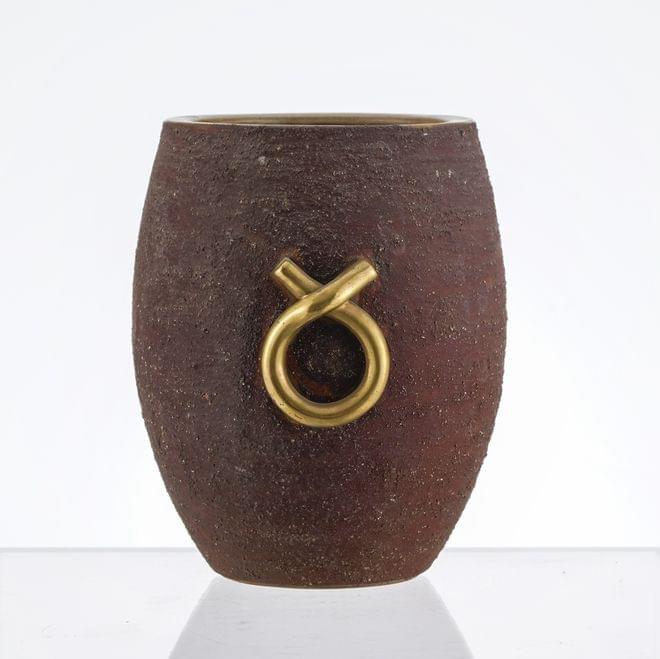 Vase balustre, céramique à engobe beige mouchetée et filets or,...
