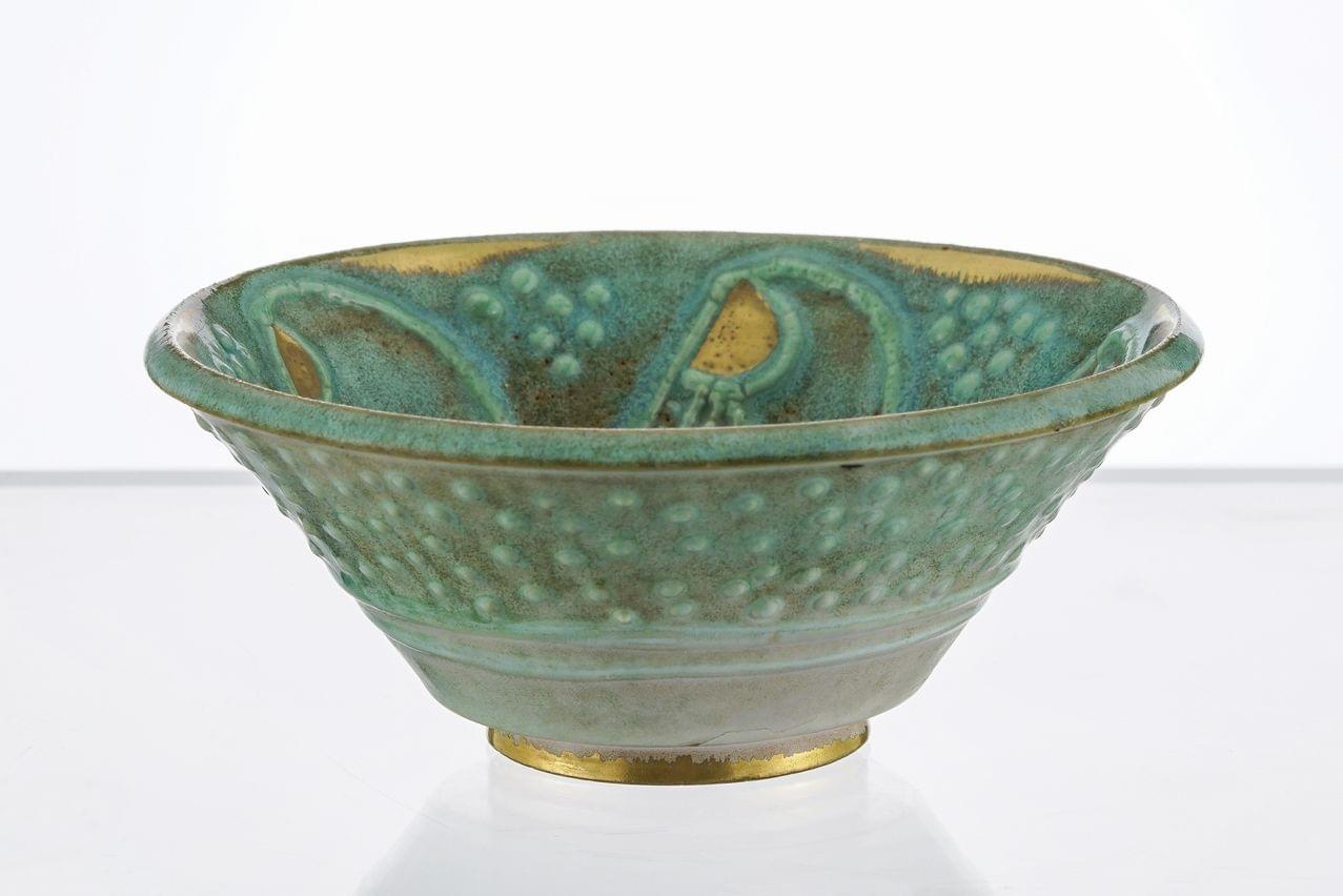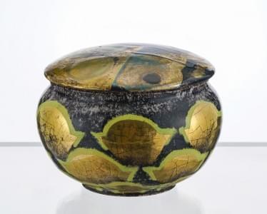Boîte couverte et coupe à décor d'une étoile, céramique émaillée turquoise, noir, jaune et or, marque de la Poterie de la Chapelle, H 13 cm et D 15 cm