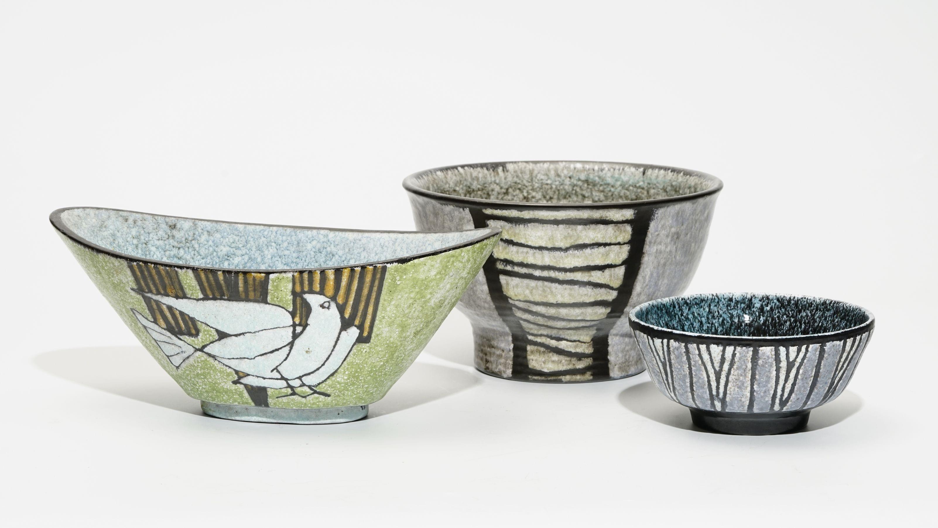 Trois coupes, céramique émaillée fourrure de lièvre et polychrome à décor de motifs stylisés, circa 1960, L de 14 à 28 cm
