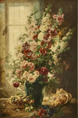Nature morte au vase de fleurs et corbeille de fruits, huile sur...