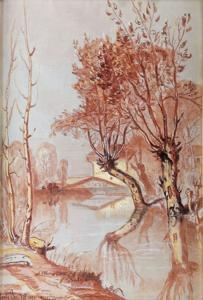 Arbre sur une rivière, fusain et gouache sur papier, signé et da...