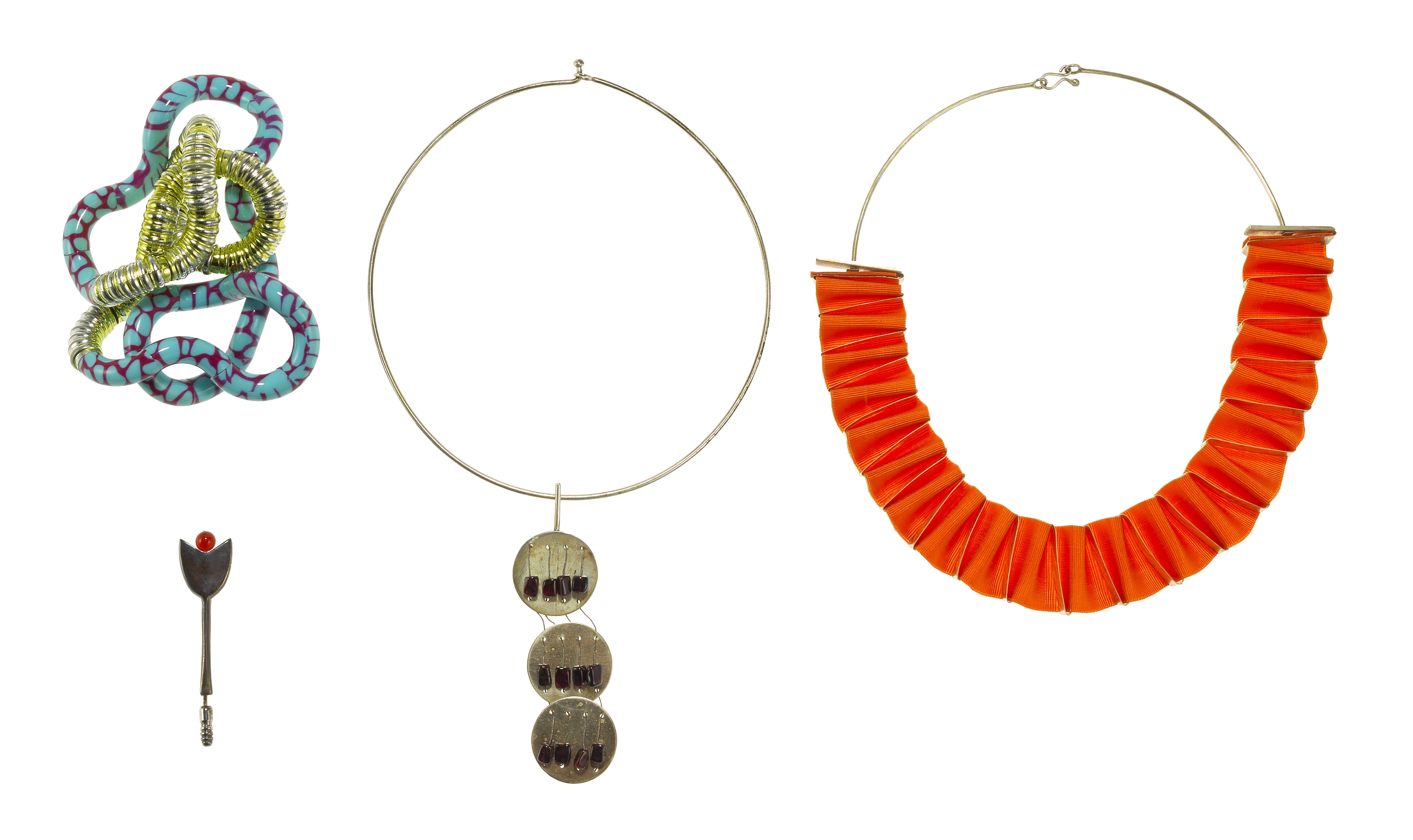 Un des colliers non signé attribué à, argent 925 et grenats, L env. 38 cm, H 6 cm. On joint une sculpture modulable de Richard X Zawitz "tangle", plastique bleu, rose et jaune. Provenance: collection Marisa Perret-Rezzonico