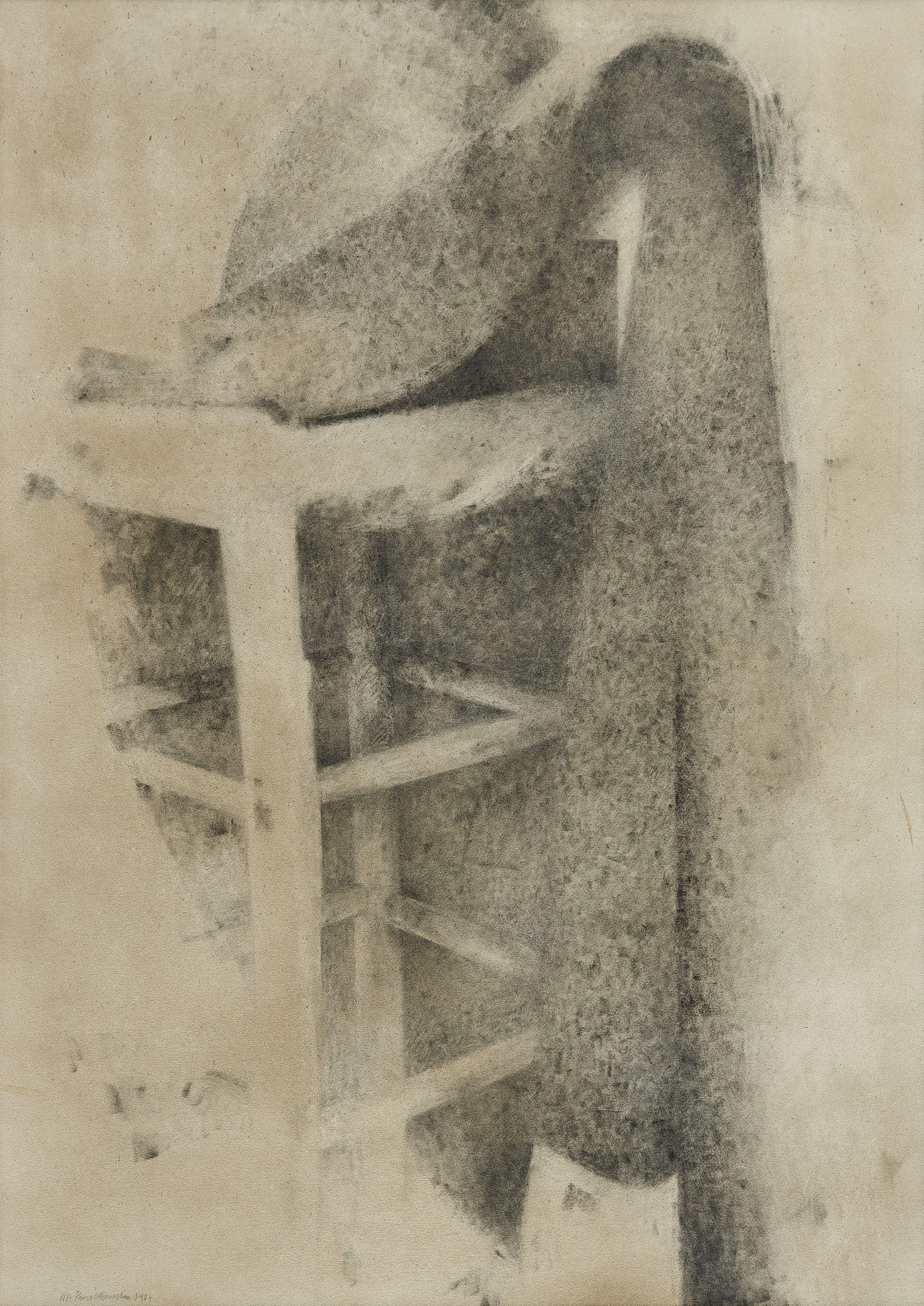 JK 3961, fusain sur papier, 113x72 cm. Exposée à la Galerie Diteskhein, Neuchâtel, décembre 1990-janvier 1991.
