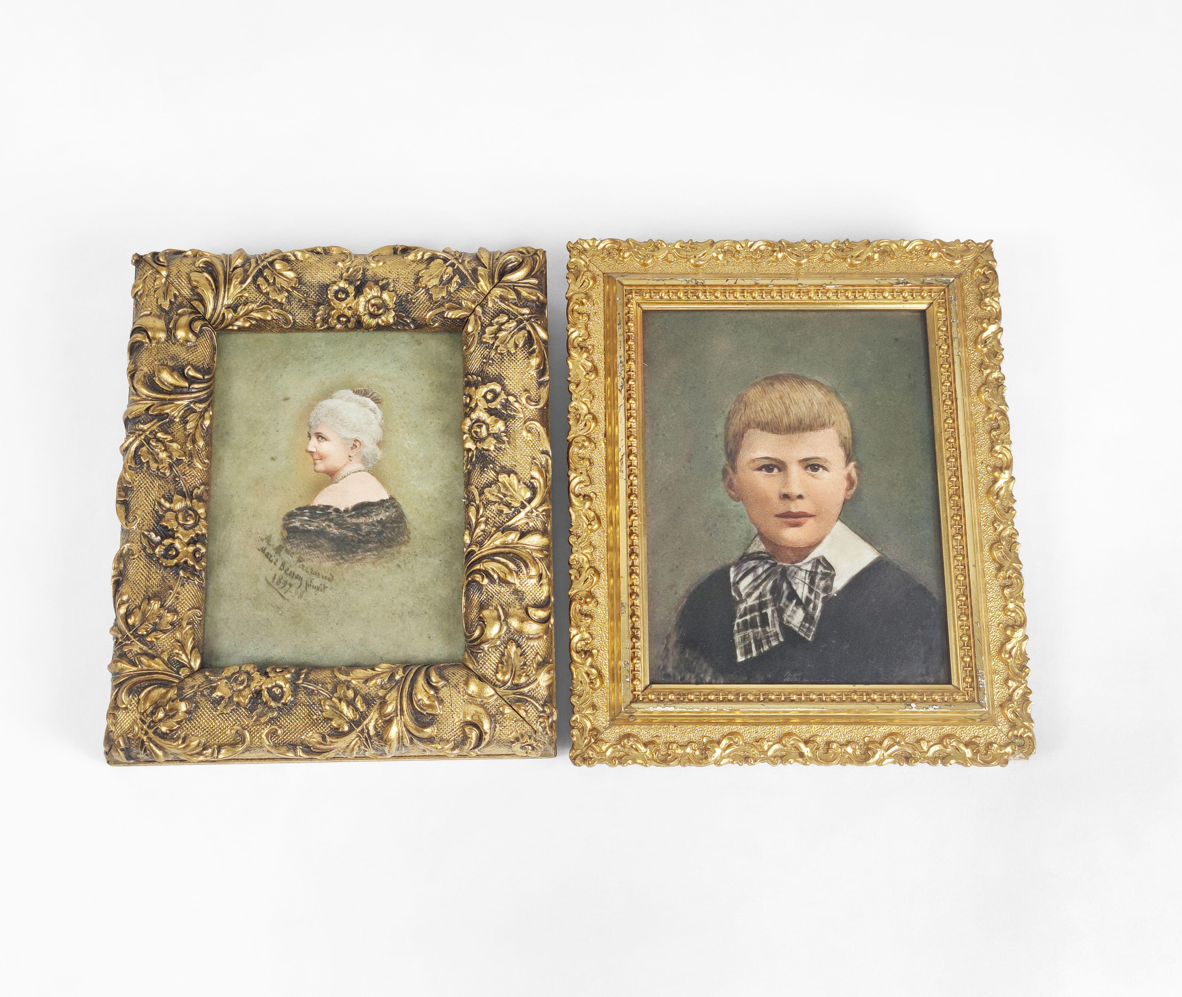 Deux portraits, miniatures sur porcelaine, signées, 11x15 cm