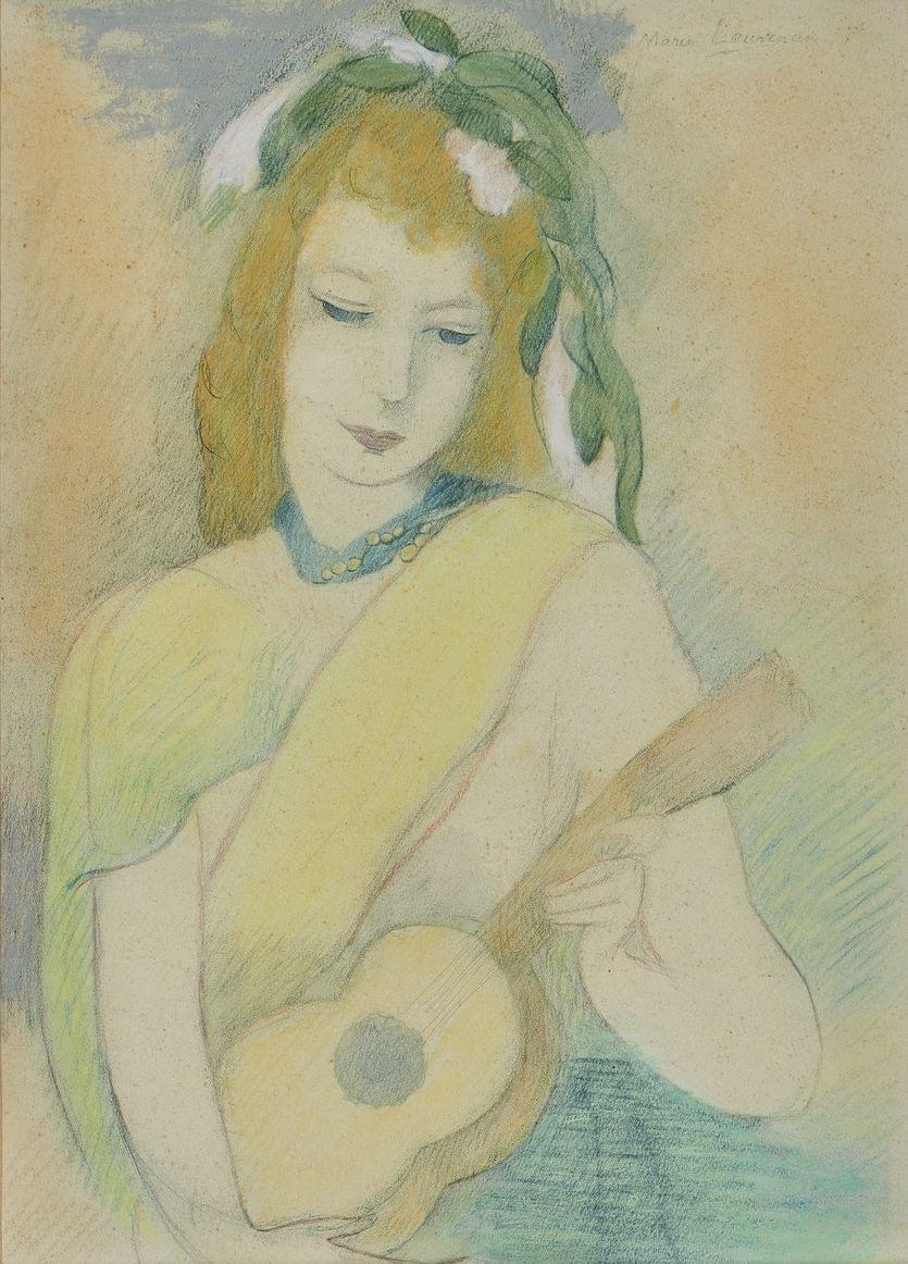 Jeune fille à la guitare, lithographie réhaussée de crayons de couleur et pastel, signée, 36x25 cm