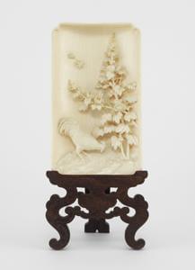 Ivoire sculpté en bas-relief de pivoines et coq, H 15 cm
