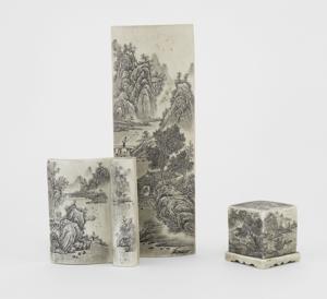 Biscuit de porcelaine à motifs peints en grisaille de paysages,...