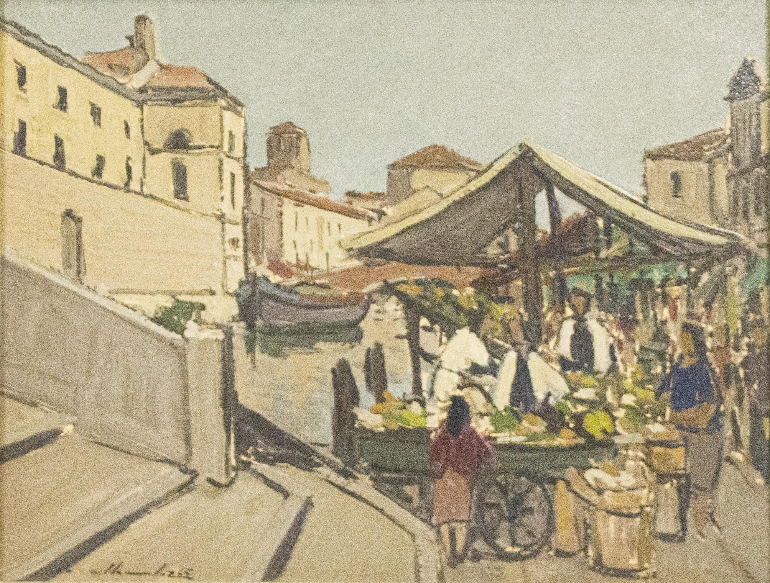 Marché au bord du canal (Chioggia), huile sur pavatex, signée et datée 65, 27x35,5 cm