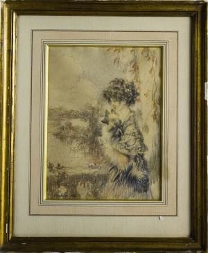Elégante au chien, sanguine et crayon sur papier, signées, 4x18,...