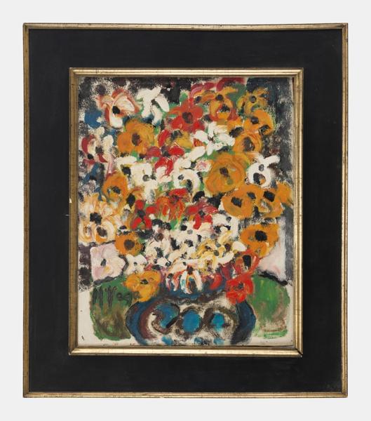 Bouquet de fleurs sur un entablement, huile sur panneau, signée, 40x33 cm