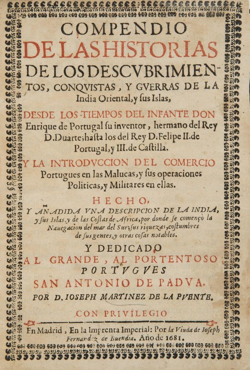 67. MARTINEZ de La PUENTE: Compedio de las Historias de los descubrimientos, conquistas y guerras de la india oriental y sus Islas. Madrid, 1681;