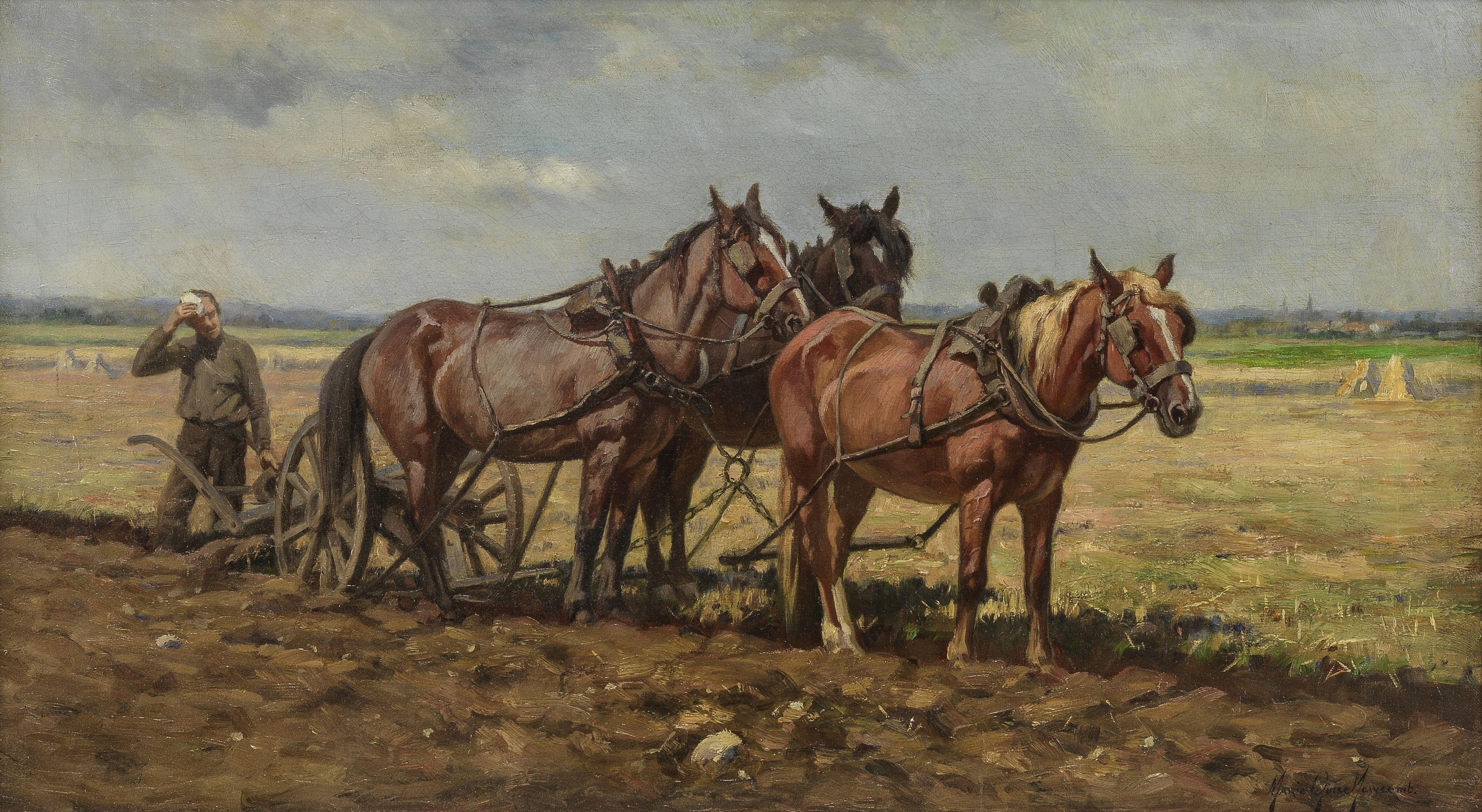Charrue tractée par les chevaux, huile sur toile, 38x69 cm
