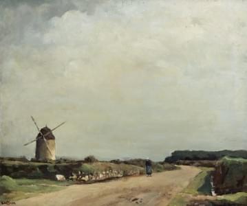 La paysanne et le moulin, huile sur toile, signée, 50x60 cm