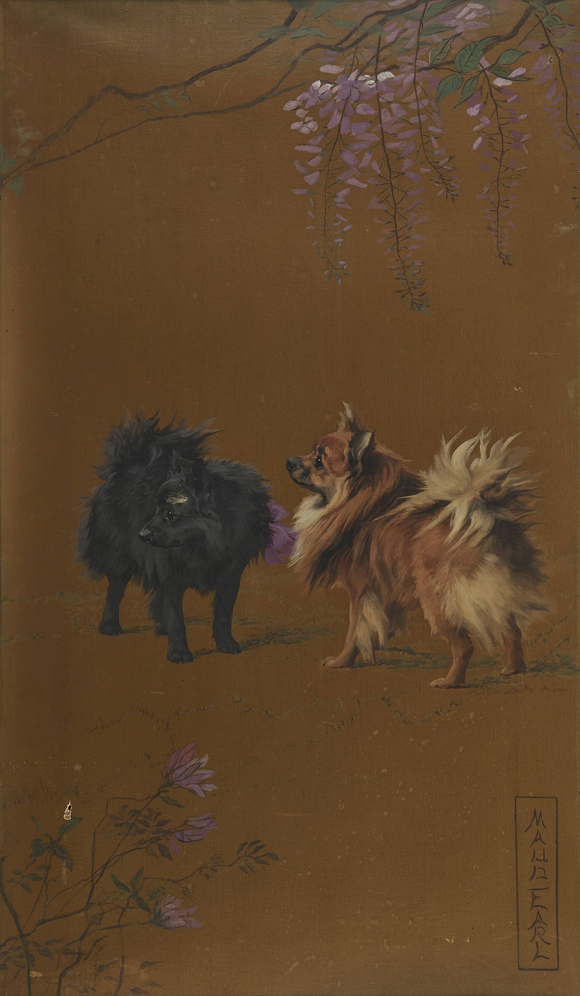 Duo de chiens dans l'esprit japonisant, huile sur papier, signée, 101x58 cm