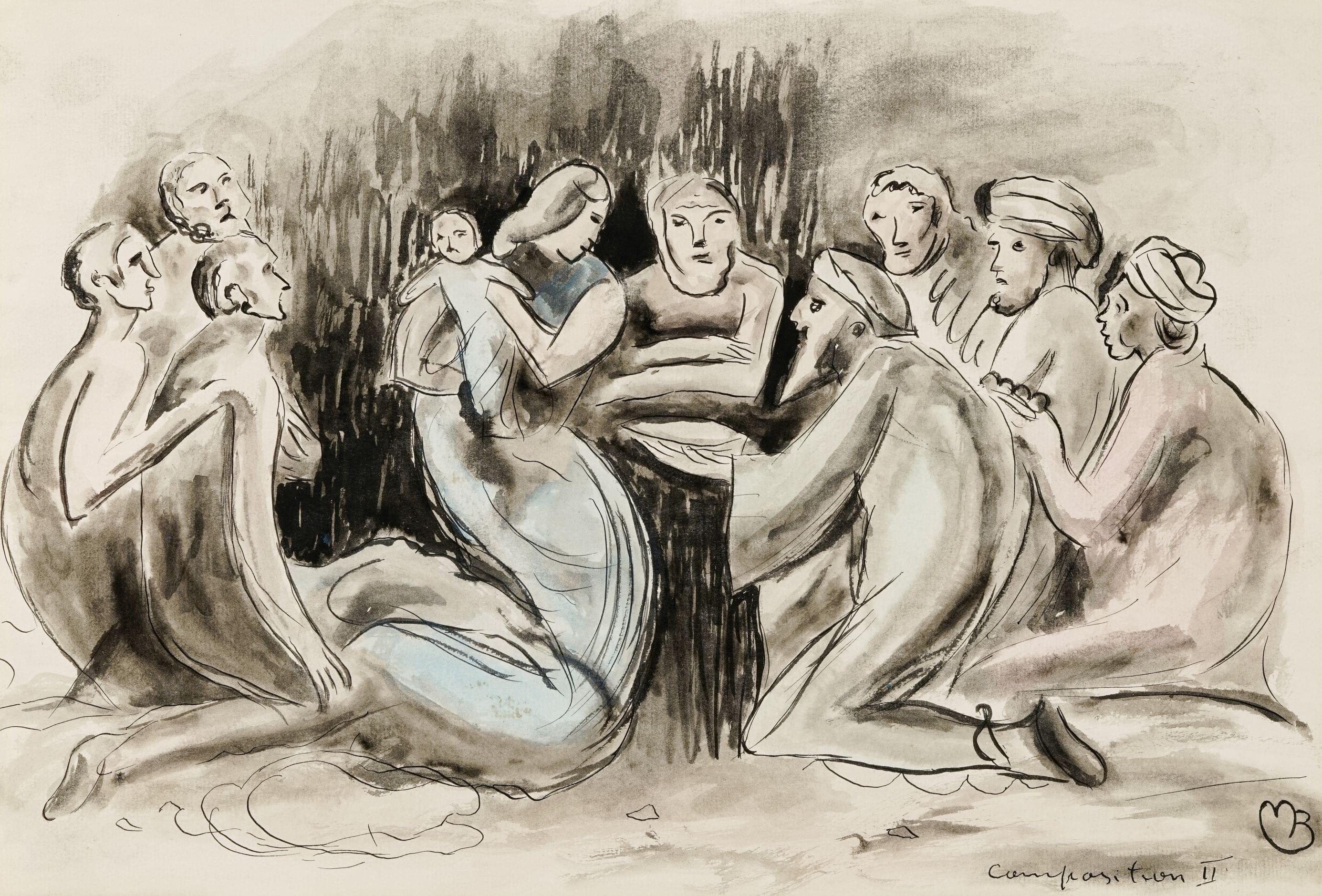 L'Adoration des Mages, lavis et aquarelle sur papier, monogrammé, et titré composition II, 28x41 cm