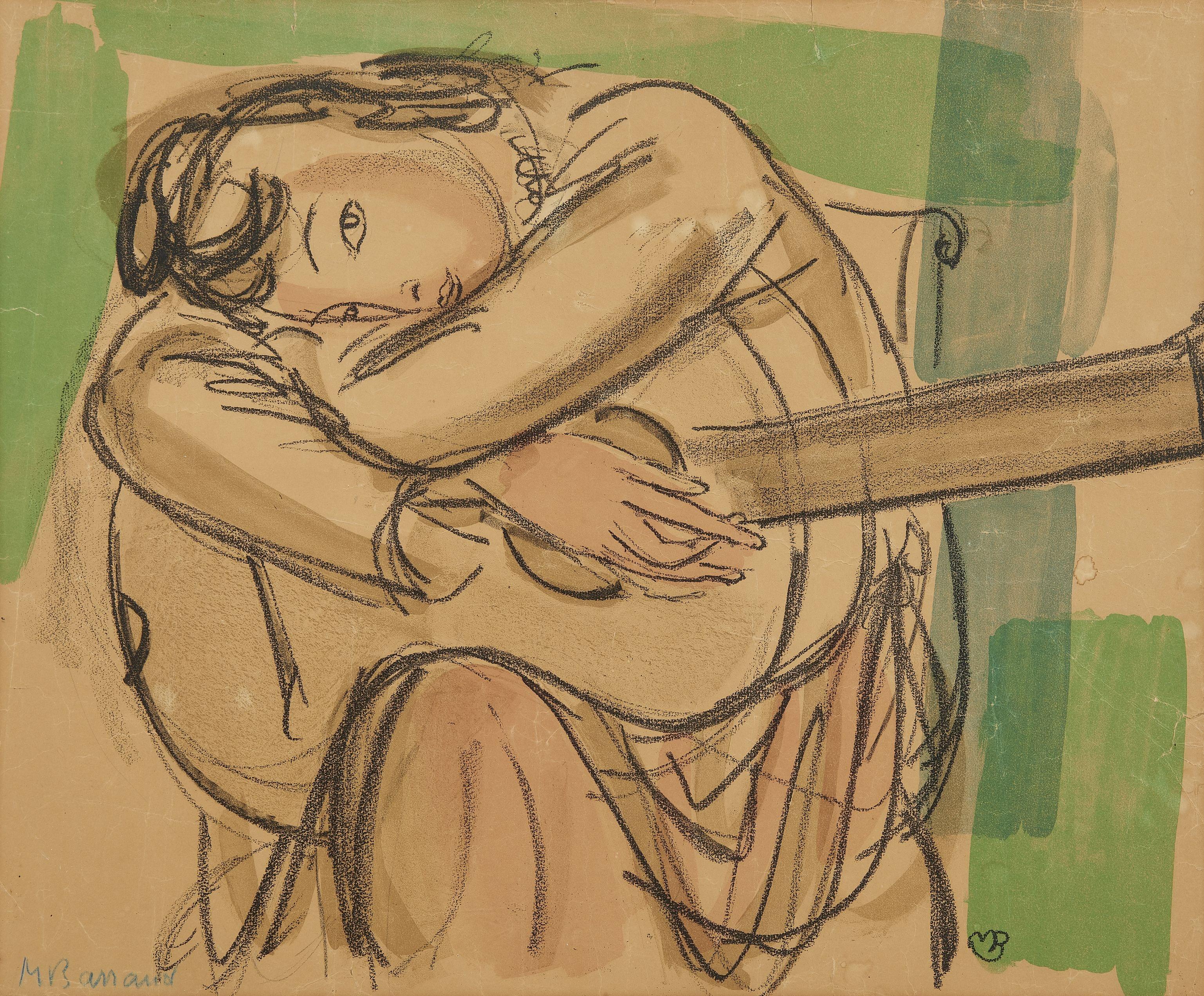 Femme à la guitare, aquarelle sur papier, signée et monogrammée, 49x69 cm.