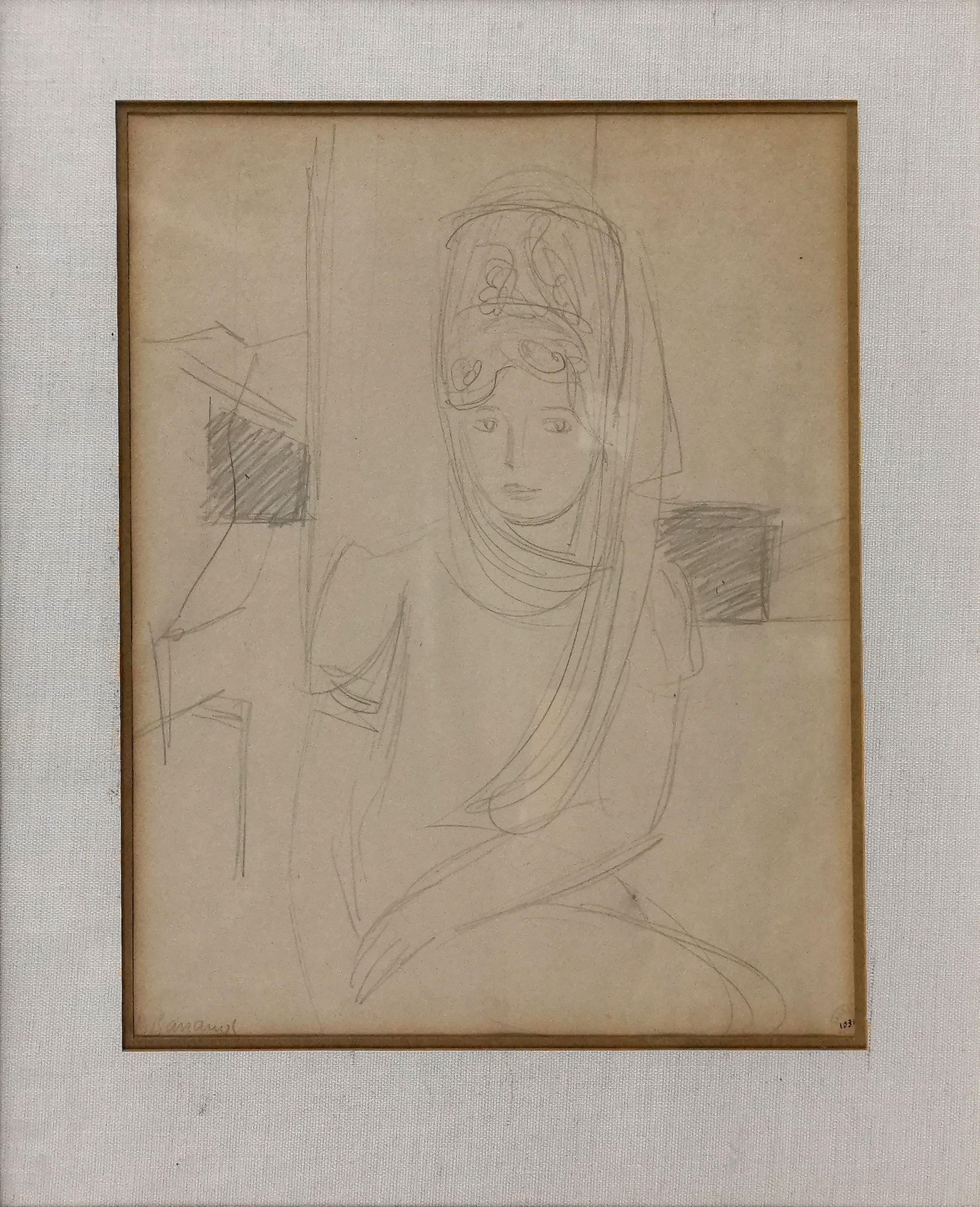 Portrait d'une jeune dame au turban, mine de plomb sur papier, signature et cachet d'atelier, 30x23 cm