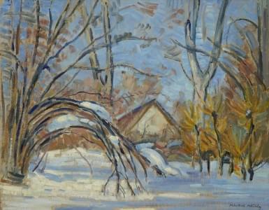 Paysage hivernal, huile sur carton, signée et datée au dos 1939,...