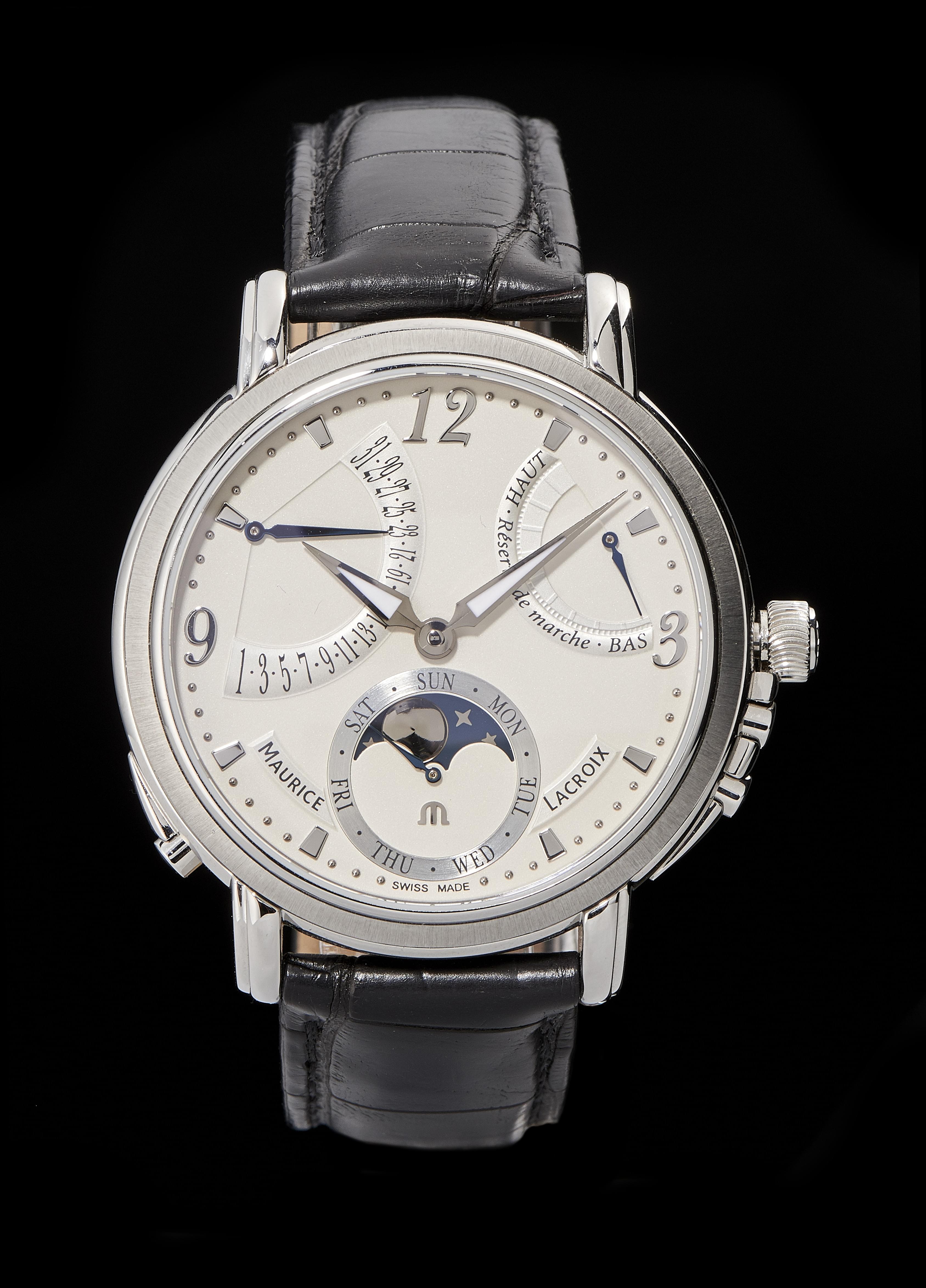 Cadran crème, chiffres arabes argentés, aiguilles bleues et argentées, indication de la date, du jour, des phases de Lune et de la réserve de marche, réf. MP 7078, acier, D 42 mm