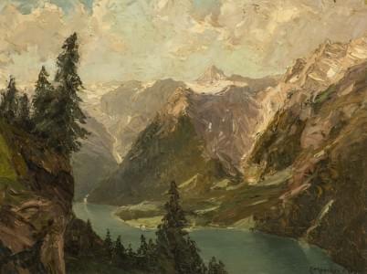 Vue du Königsee, huile sur panneau signée, 64x84 cm