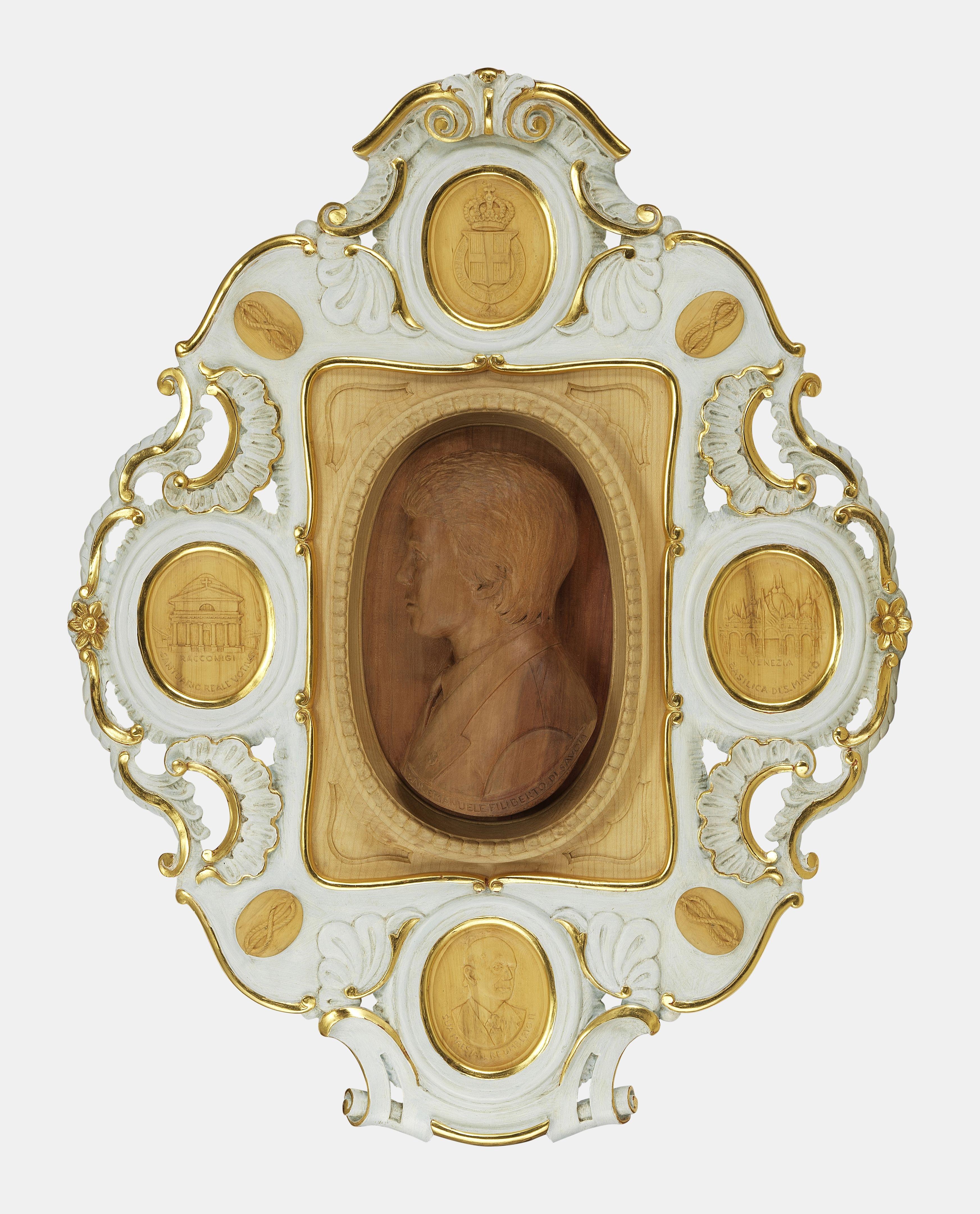 Figurant le profil du prince Emmanuel-Philibert de Savoie, daté 1989, Torino, bois sculpté, laqué blanc et doré, 72x56 cm. Provenance: Collection Prince et Princesse de Savoie. Provenienza: Collezione Principe e Principessa di Savoia