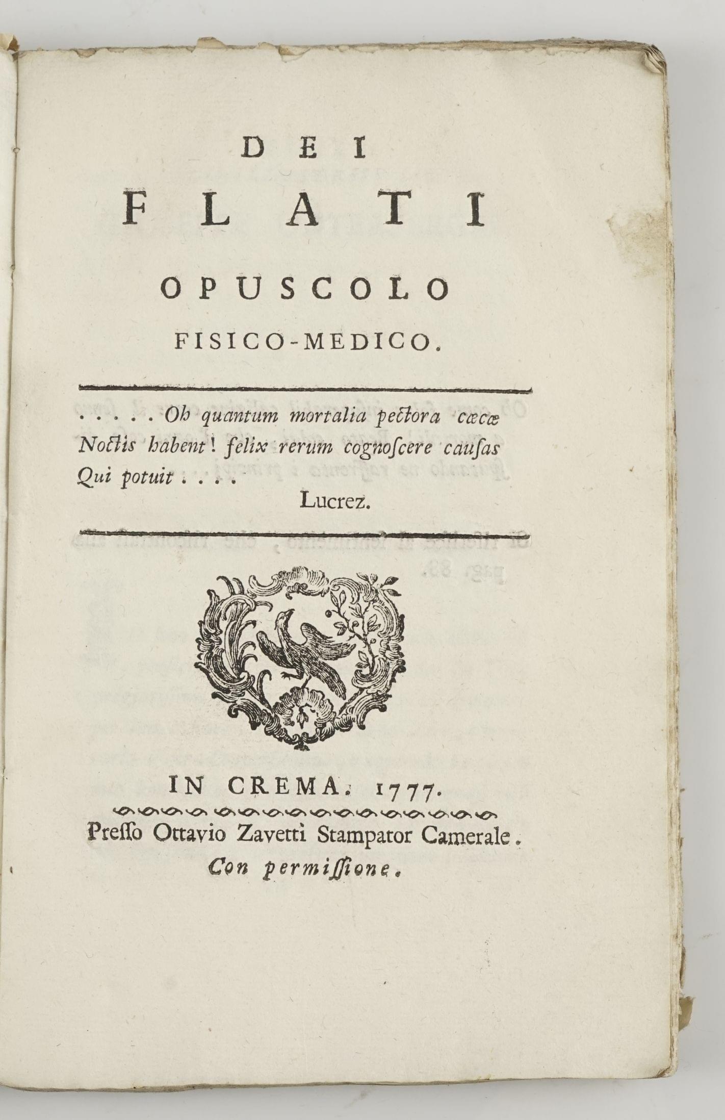 58. MEDECINE. ZANCHI (Lodovico) : Dei Flati Opusculo fisico medico. In Crema, 1777