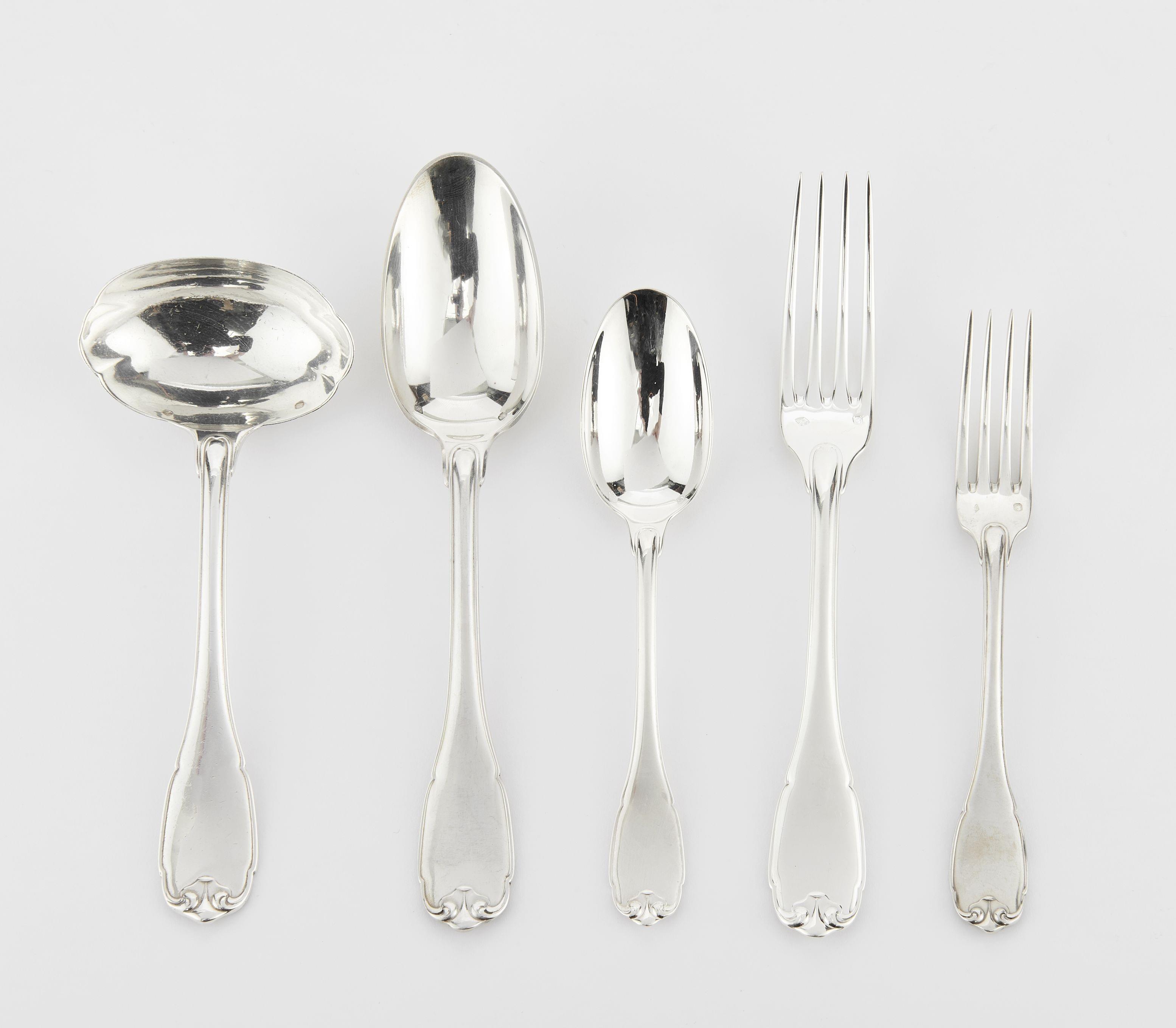 Métal argenté, comprenant: 12 fourchettes, 12 couteaux et 12 cui...